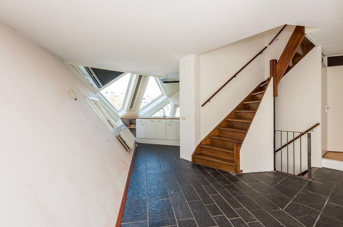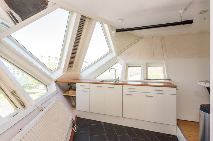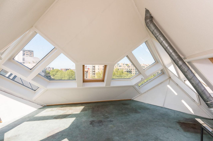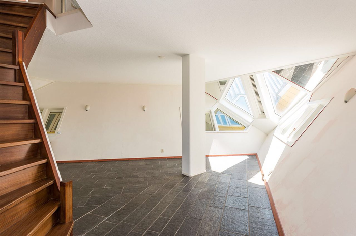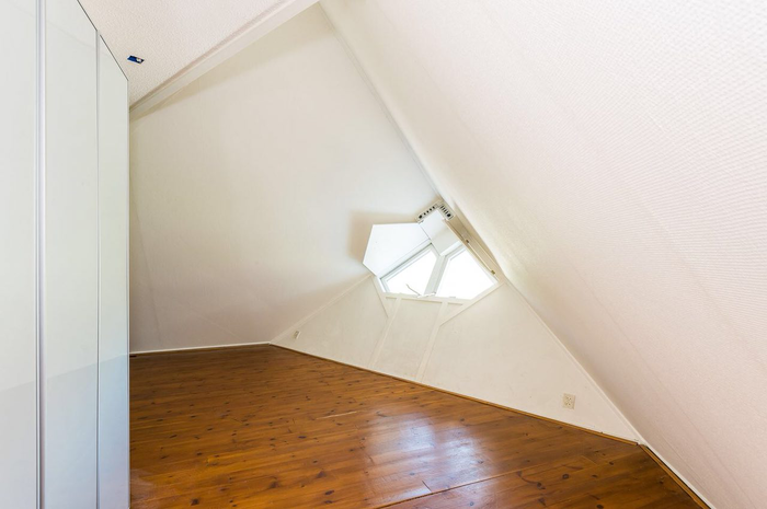 - Почти все кубы +/- одинаковой планировки. В этом доме 4 комнаты: в нижней части куба (на первом этаже) - гостиная и кухня, на втором - 2 спальни безумной конфигурации и ванная комната, и еще одна недоспальня - на третьем этаже, прямо под верхушкой куба, с окнами в потолке (романтика, чо)