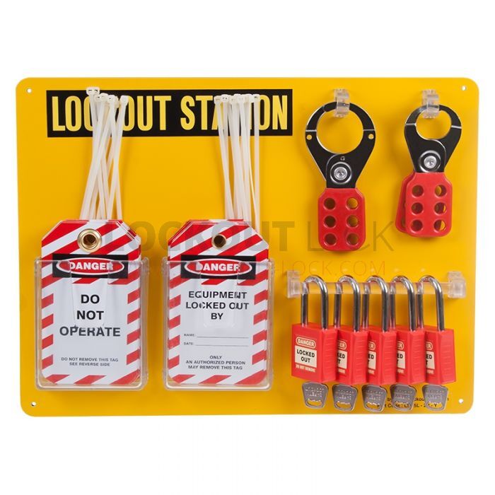 Если работников несколько, или нужно заблокировать много переключателей, то используются замки со станции LOTO, ключи все складываются в специальный ящик, на котором множество отверстий для личных замков работников. Работники замыкают этот ящик на свои замки с бирками. И пока последний работник не снимет свой замок, все ключи заперты в ящике.