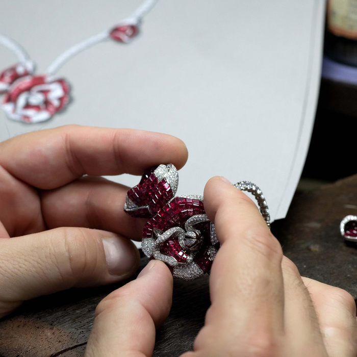 Тщательно продуманная и сконструированная, «Peony Princess» отражает движение цветка, кропотливо воспроизводя реальную красоту. «Я предоставила дизайнерам фотографию японского пиона и сказала, что хочу, чтобы украшение выглядело именно так», - объясняет Анна. «Я попросила команду дизайнеров сделать цветы максимально реалистичными. Рубины и бриллианты расположены не случайным образом, а как полосы на самом цветке». Что касается двухцветного дизайна, Анна Страрости объясняет: «Здесь, в Stenzhorn, у нас есть особый стиль, и мы никогда не используем более двух цветов в одном изделии».