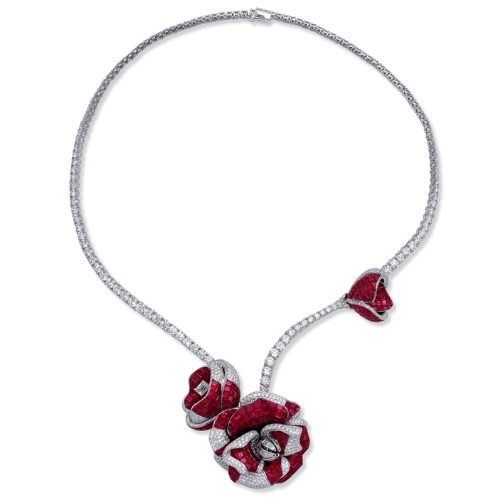Пионы оживают благодаря умению Stenzhorn сочетать техники закрепки с большим мастерством, для создания этого украшения было использовано 25 карат лучших темно-розовых бирманских рубинов и 20 карат белых бриллиантов высшего качества. Невидимо закрепленные рубины, каждая огранка которых индивидуальна, чтобы соответствовать волнистой форме лепестков, обеспечивают глубокий, гладкий красный цвет, который, кажется, плавно скользит по цветам. Этот насыщенный красный цвет контрастирует с ярко-белым алмазным паве, создавая драматический эффект. Если присмотреться к самому большому цветку, то можно увидеть, что в самом центре бриллианты расположены таким образом, что даже самые маленькие лепестки идеально окутывают драгоценные камни.