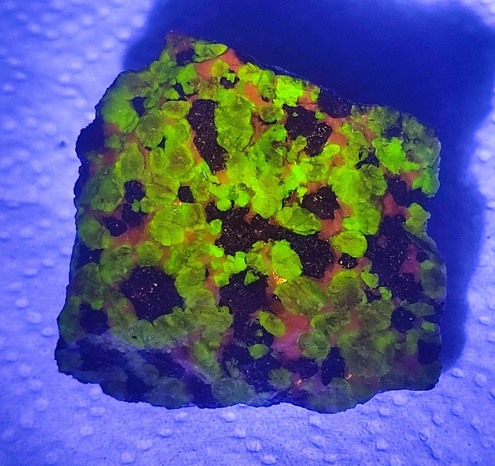 Здесь и на следующем снимке тот же самый образец при увеличении длины волны УФ-излучения (365-395 нм). Цвет флюоресценции виллемита становится потихоньку тускнее, зато кальцит начинает светиться розово-красным. Из собрания автора