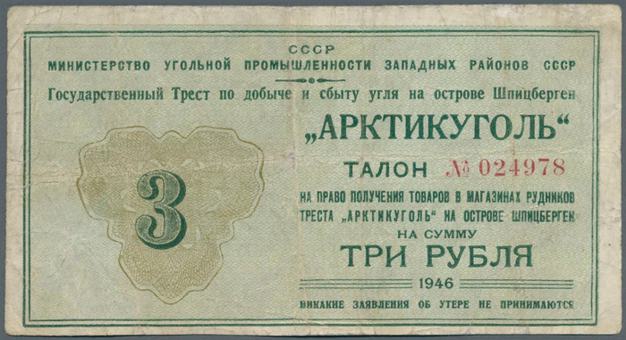 Шпицберген. Арктикуголь. 3 рубля 1946 года.