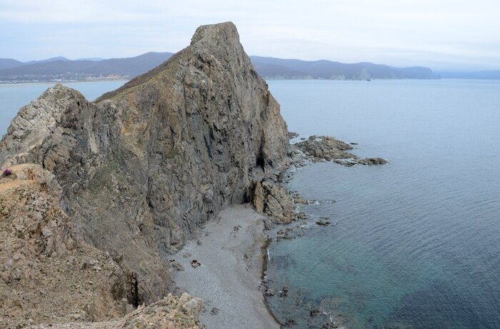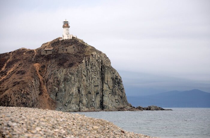 Отправляемся в обратный путь - и видим второй объект с тысячной купюры - мыс Бринера и маяк Тетухе (Рудный). Лезем в горы!