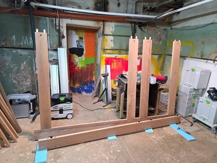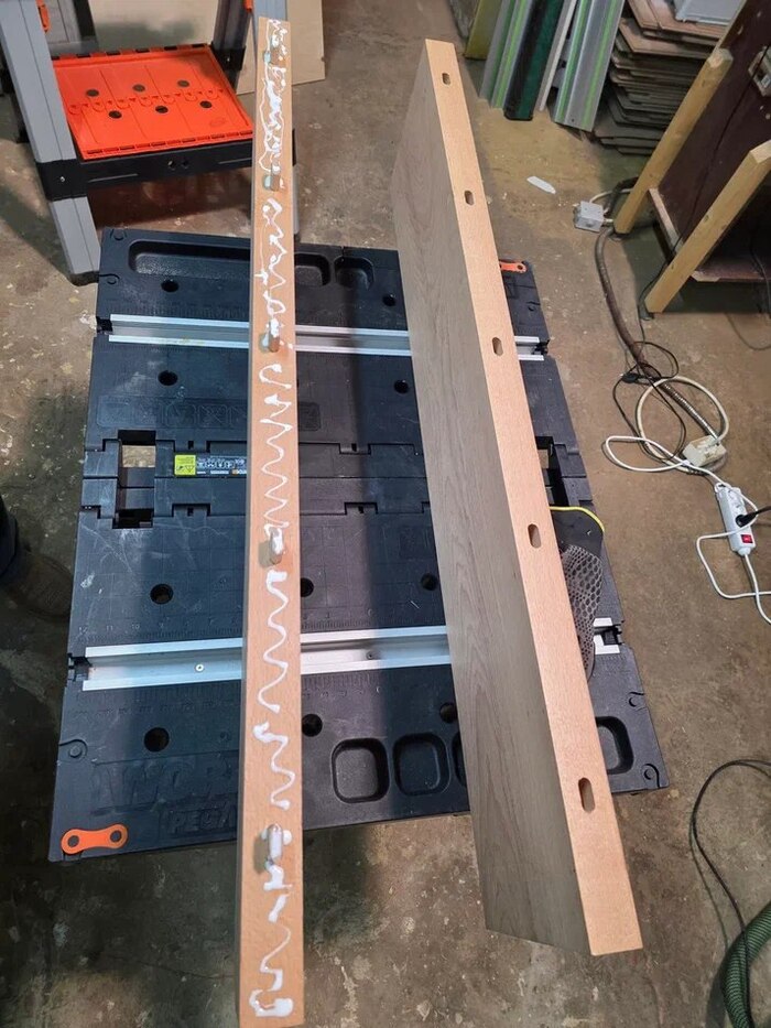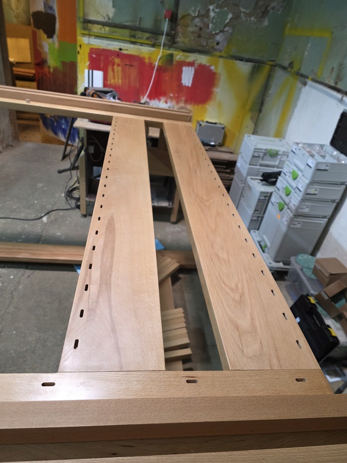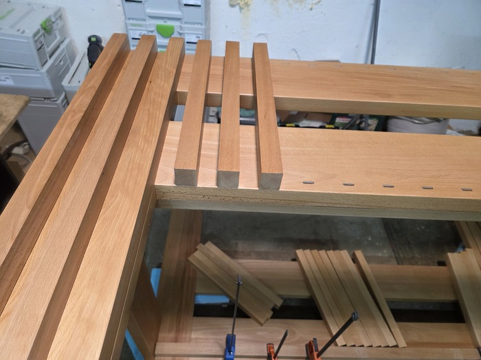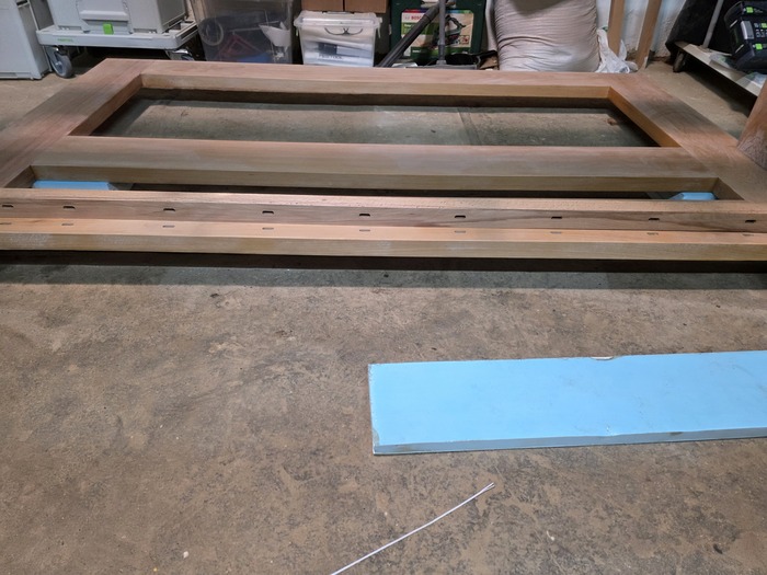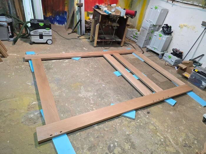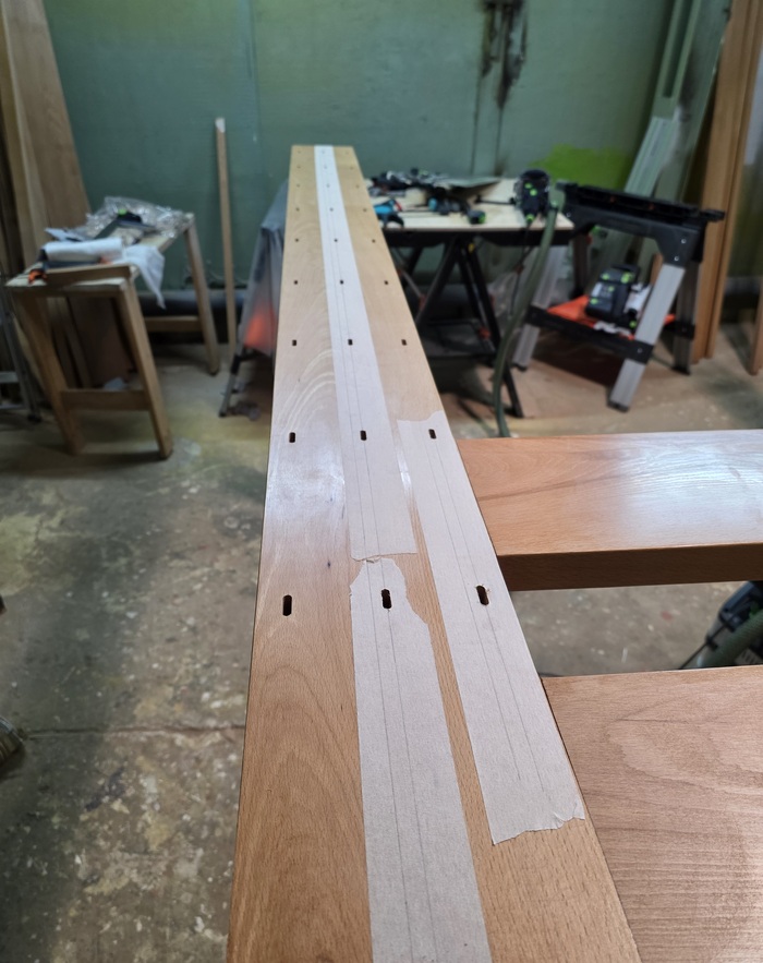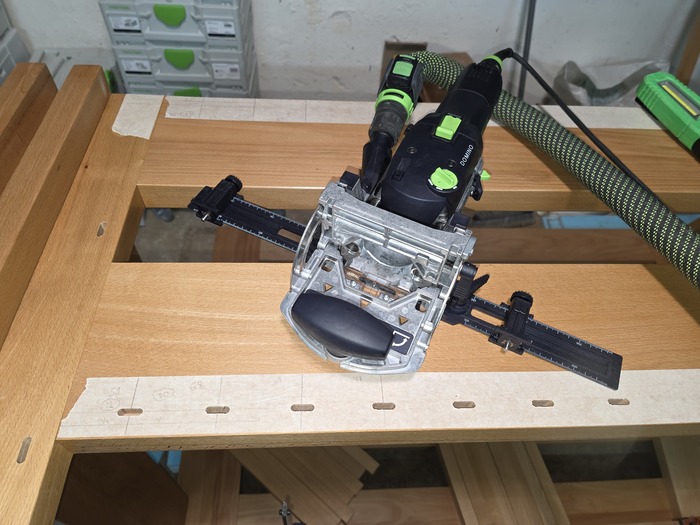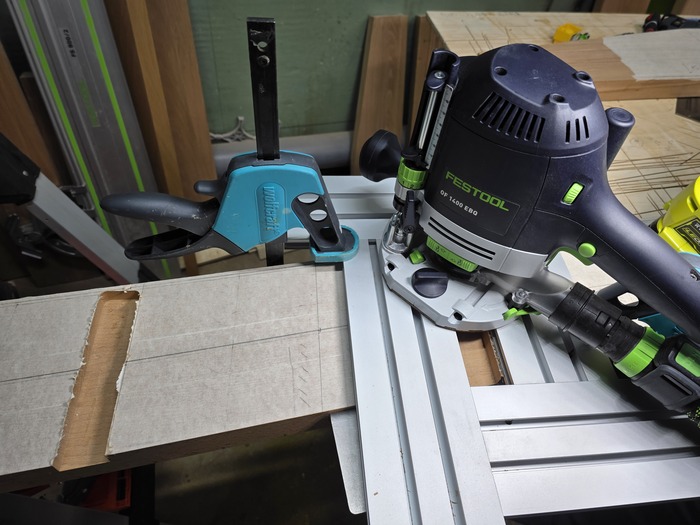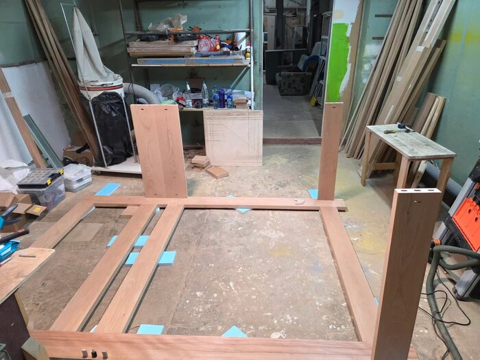 Фрезеровал пазы вертикальным фрезером первый раз, поэтому не обошлось без косяков, которые пришлось устранять. Не ожидал, что когда ведёшь фрезер чихать нельзя и его сразу уводит ))). После фрезеровки - снова сборка кровати. Уже с дополнительными перемычками.