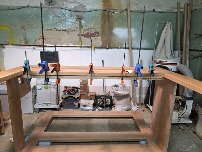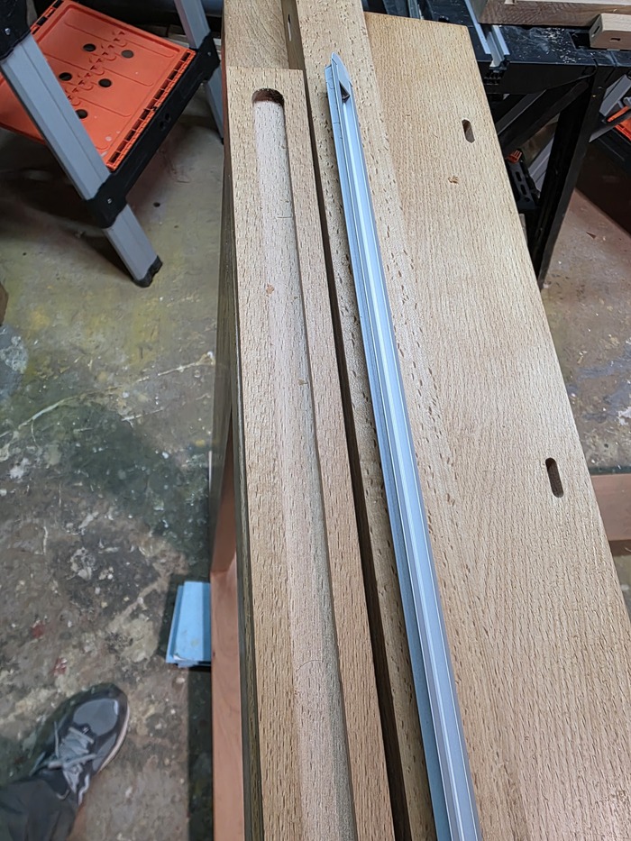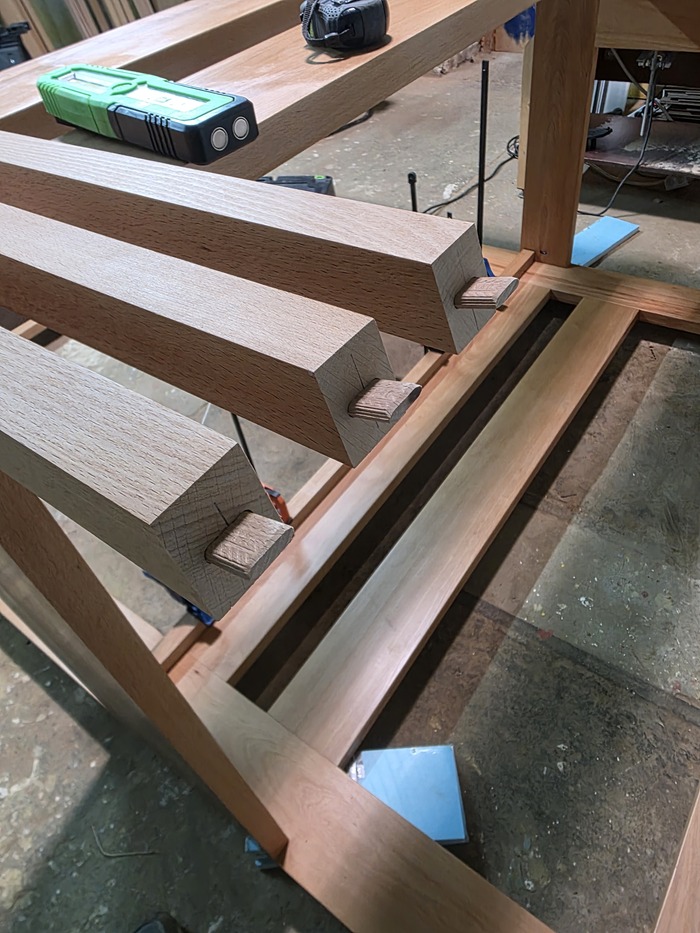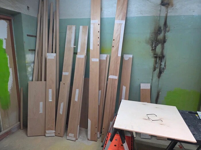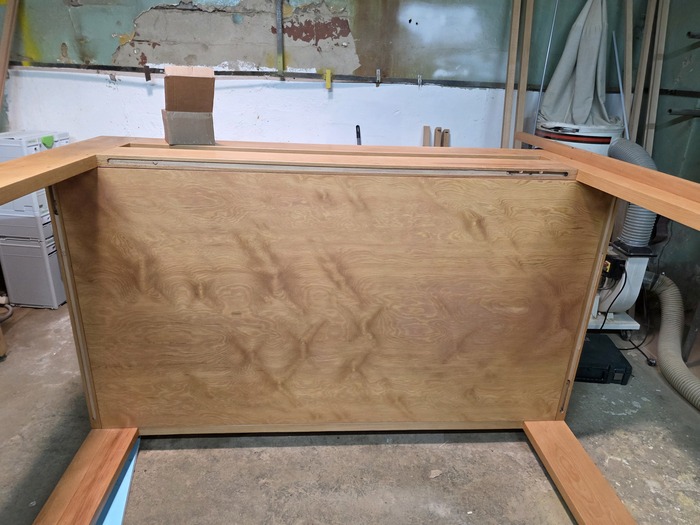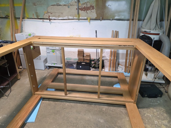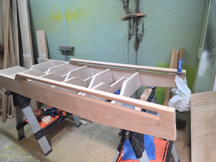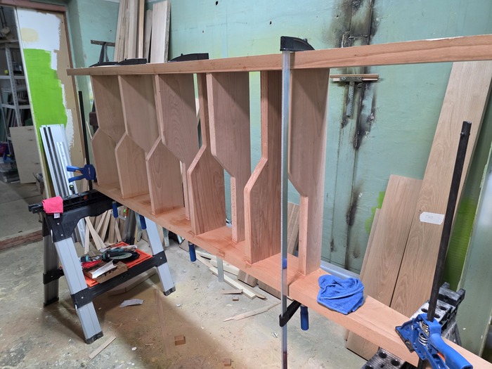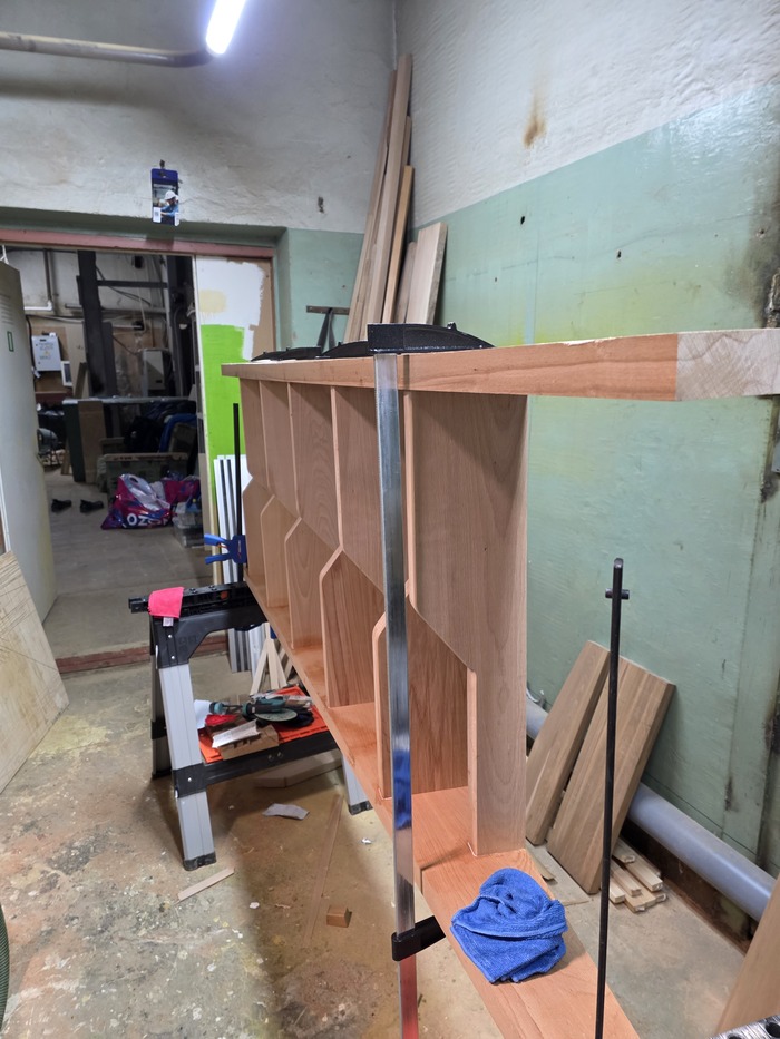 Фрезеровал пазы вертикальным фрезером первый раз, поэтому не обошлось без косяков, которые пришлось устранять. Не ожидал, что когда ведёшь фрезер чихать нельзя и его сразу уводит ))). После фрезеровки - снова сборка кровати. Уже с дополнительными перемычками.