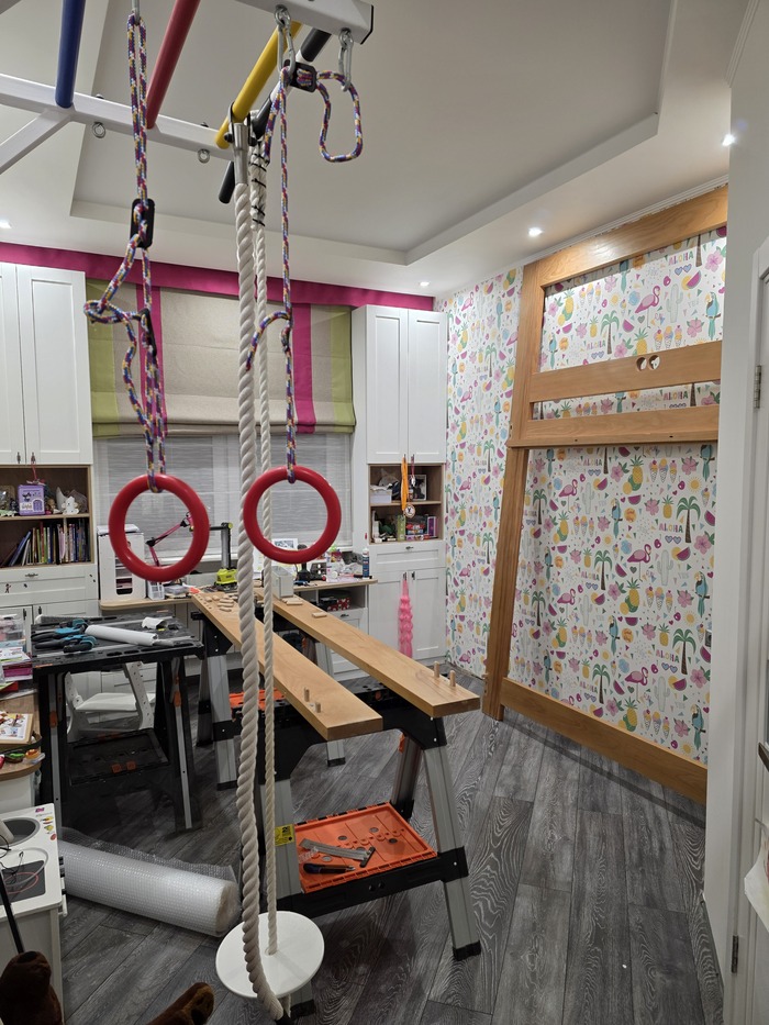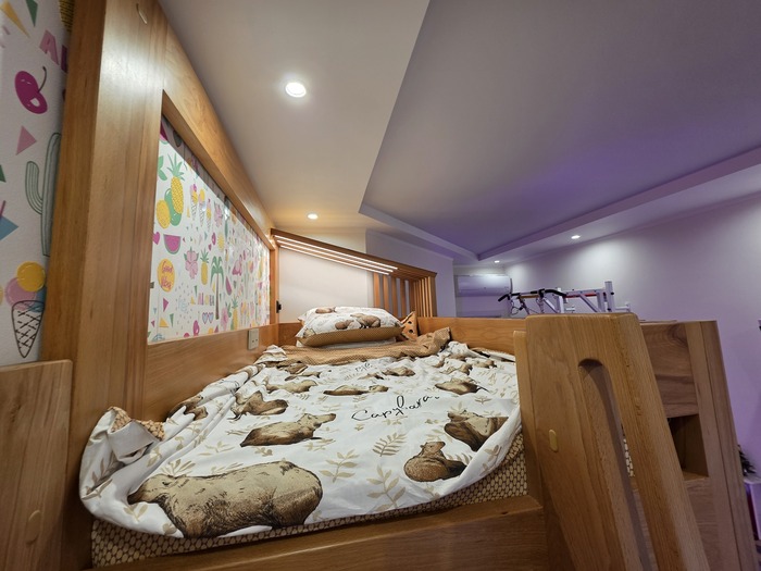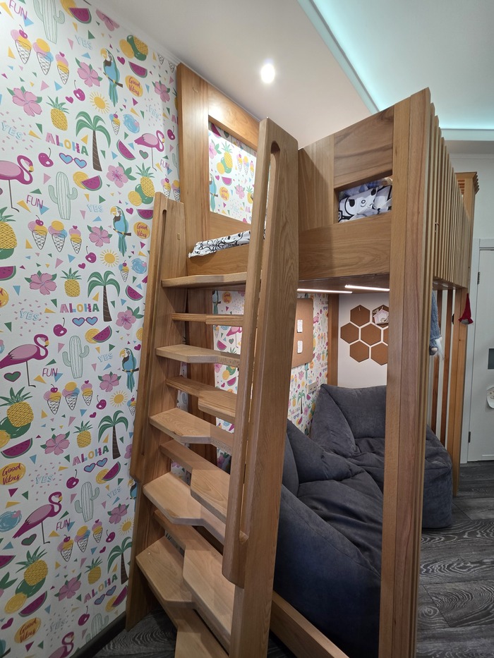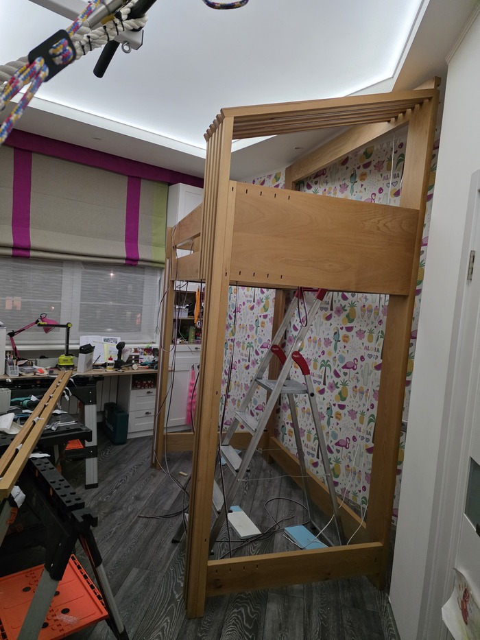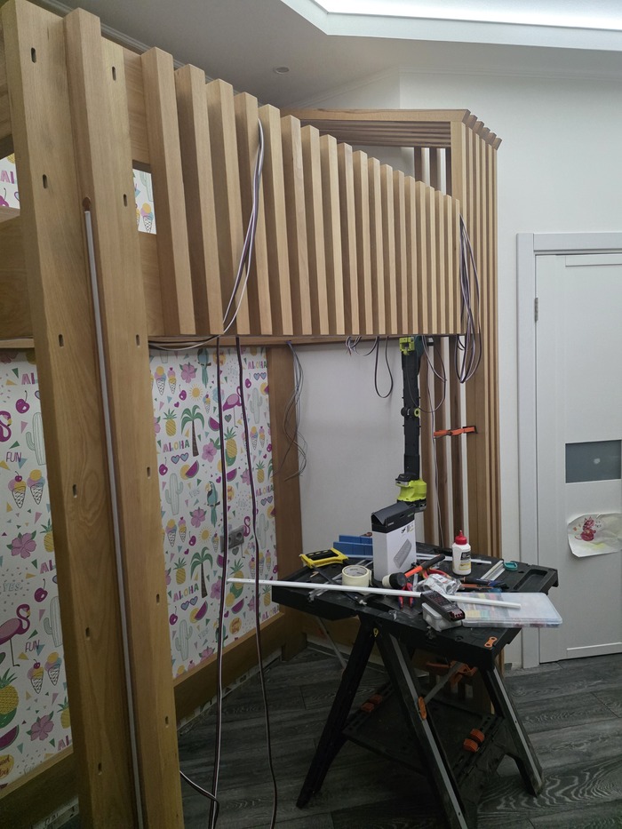 Полюбоваться долго не получилось. Всё снова пришлось разбирать, чтобы начать фрезеровать под светодиодную ленту. Всего в процессе работы появилось 3 контура света. Свет на "первом этаже", цветная подсветка кровати, и свет на "втором этаже". Ленты решил пропускать через умные контроллеры. Управление светом по радиоканалу выключателями + через телефон + через Алису.