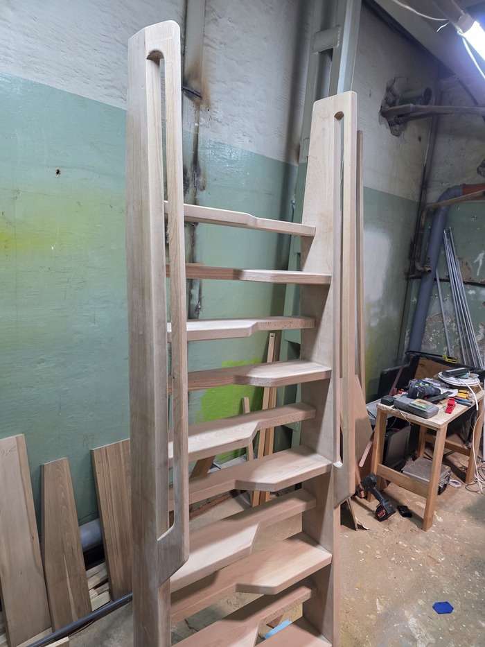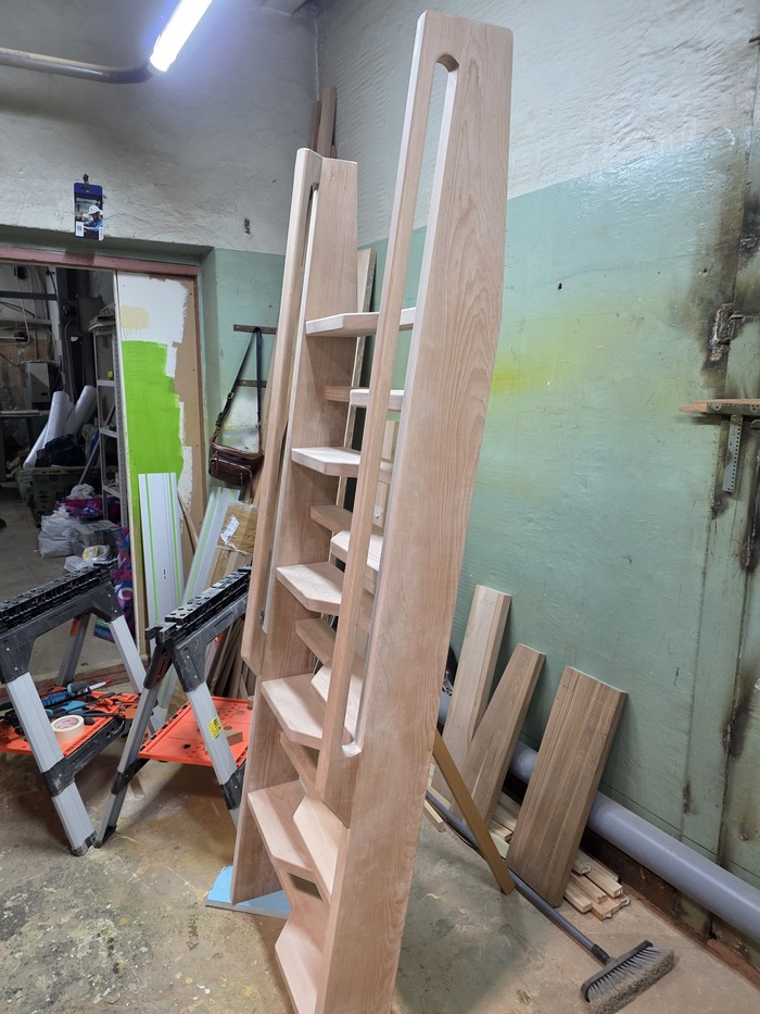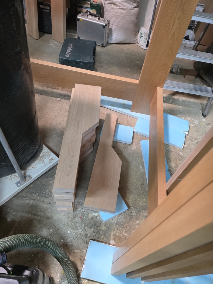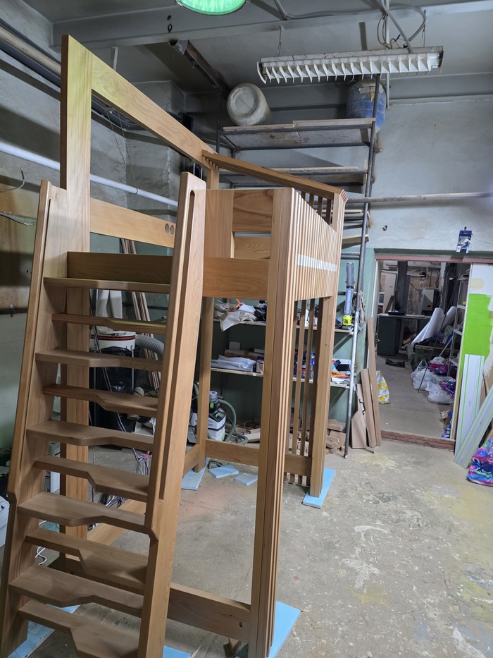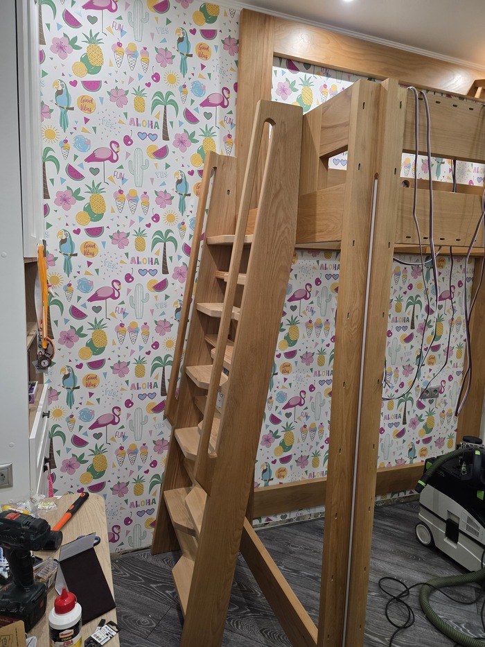 Следующий этап - лестница. Место под неё ограничено в комнате. Угол наклона не большой, поэтому было принято решение сделать перилла и ступени "гусиный шаг".