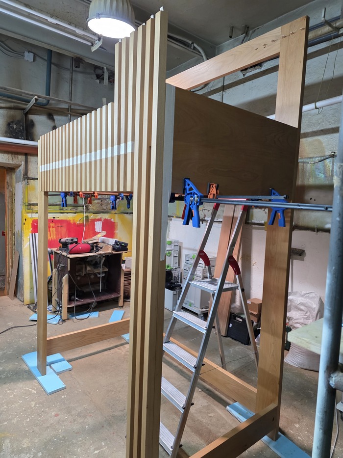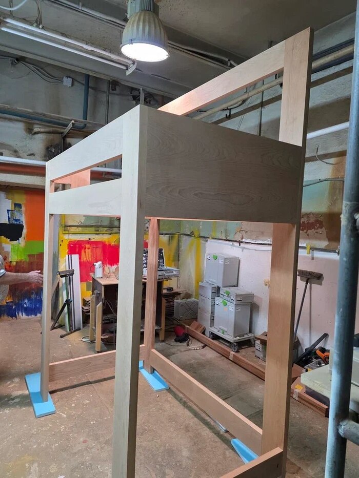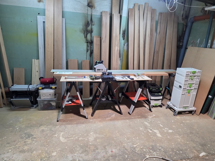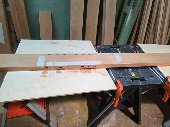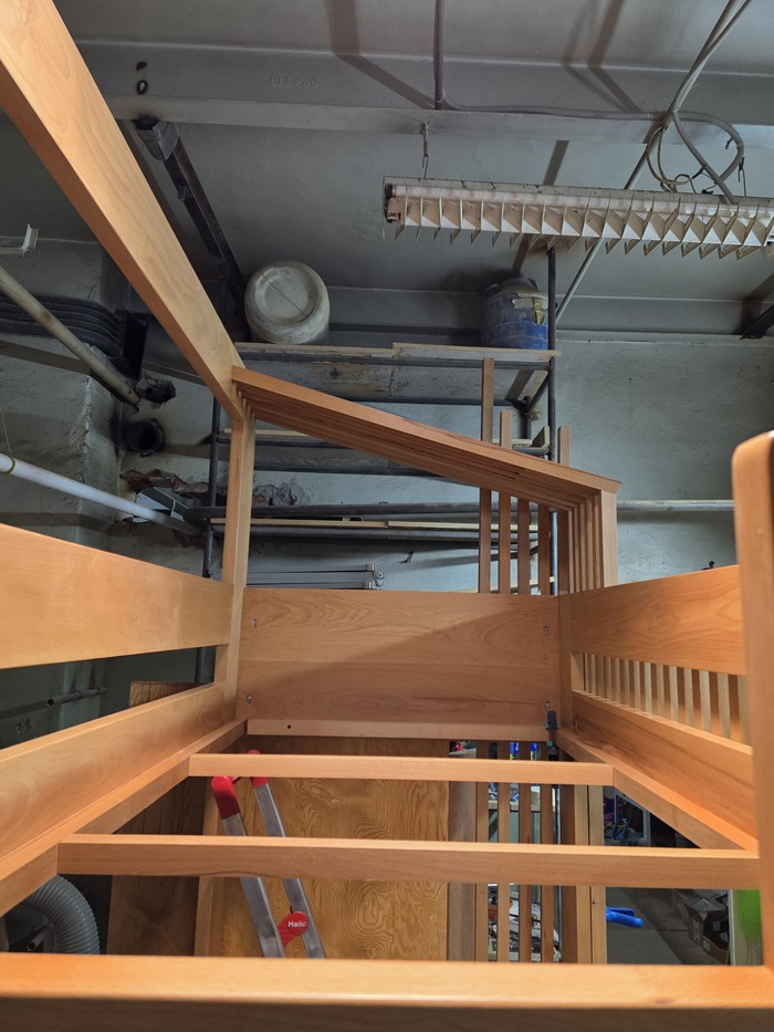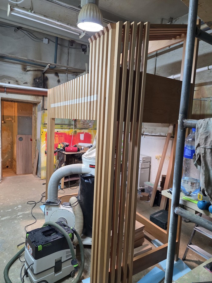 Следующий этап - лестница. Место под неё ограничено в комнате. Угол наклона не большой, поэтому было принято решение сделать перилла и ступени "гусиный шаг".