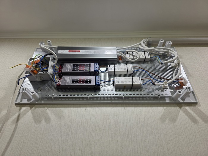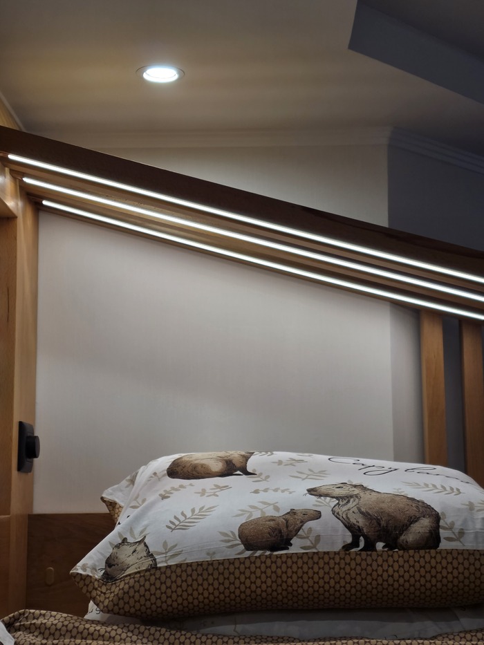 Финальный этап разработки - свет. Не буду писать как много всего пришлось перелопатить, чтобы прийти к нужному результату )). Проводка будет скрыта между двумя крышками (только 24 вольта. Всё управление и 220в. будет вынесено в кладовку в комнате. На "втором этаже" будут установлены USB Розетки для телефона/планшета.