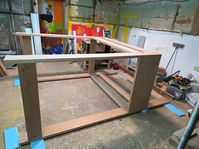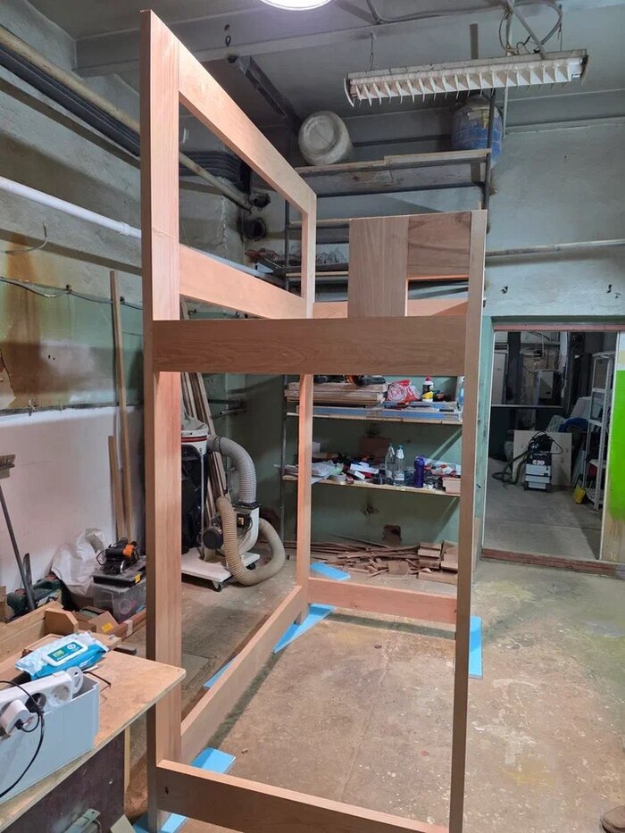 Далее - разборка, упаковка и сборка на месте. Провода внутри кровати на скрутке + пайка и термоусадка. На ножки наклеил войлок, чтобы кровать можно было сдвигать в процессе сборки. Для надежности 2 стенки кровати прикрутил к бетонной примыкающей стене.