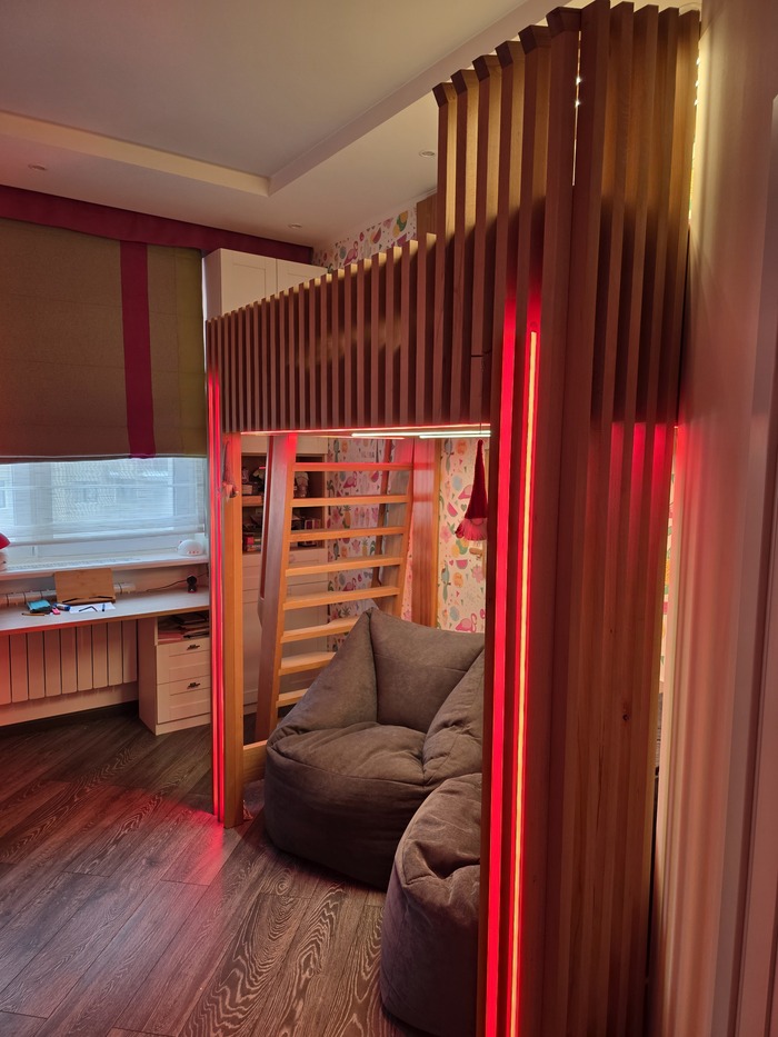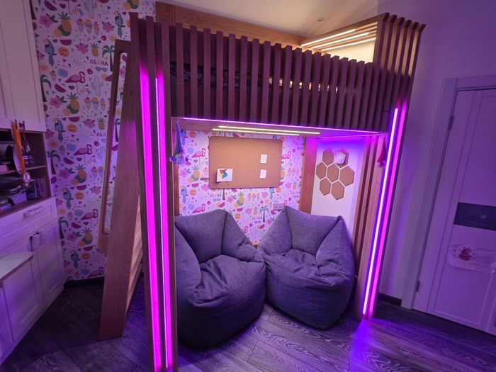 Итоговый вариант и довольный заказчик. Свет регулируется по яркости и куча возможных режимов освещения. Внизу установили легкие пуфики. Если их вытащить - дополнительная игровая зона.