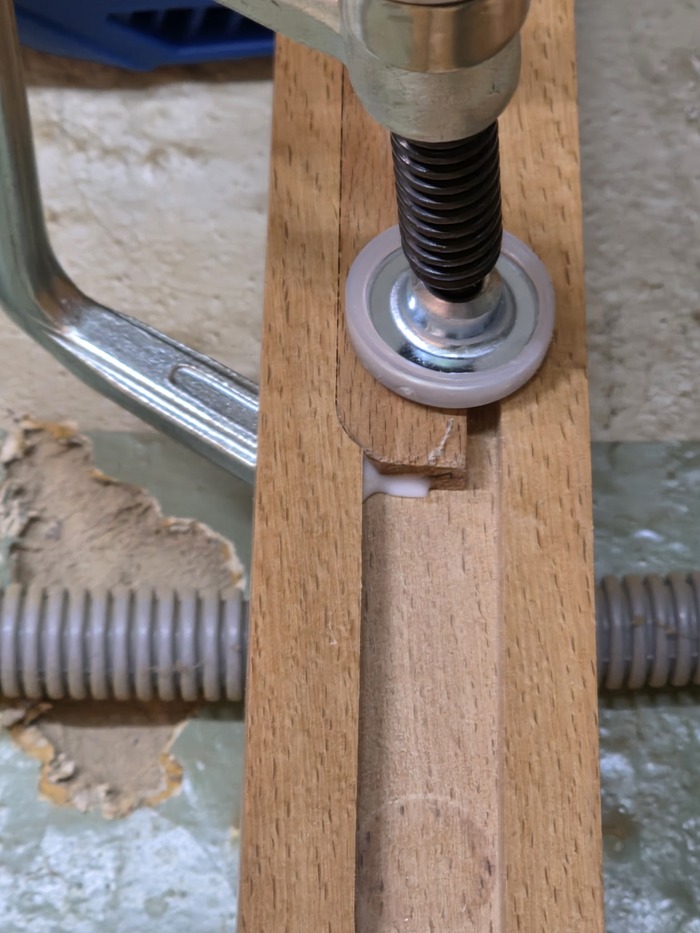 Лестницу, после изучения матчасти решил посадить на клей. Места под ступени выбирал фрезером. Перила также посадил на клей и шканты Domino