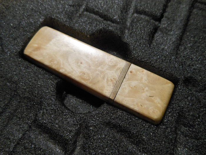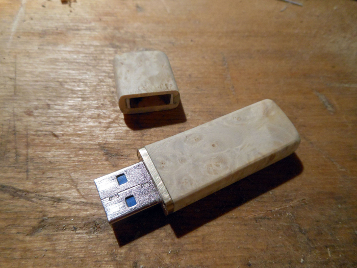 Надвигался как-то давно день рождения моей тогда еще сиииильно будущей жены. А так как я знал,что флешки таскать киношки у нее нет - решил сие исправить. Купил трансценд большой. Но взять и подарить флешку в блистере это как-то слишком просто, а мы легких путей искать не привыкли. Поэтому разбираем донора, берем кусочек кленового капа и кромсаем.