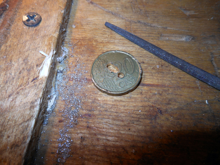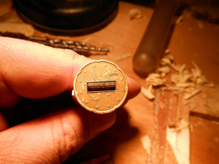 Потом так же кромсаем монеты. Несколько было испорчено, пока не нашлась не стальная внутри. Коллекционная штукенция, по нынешним-то временам.