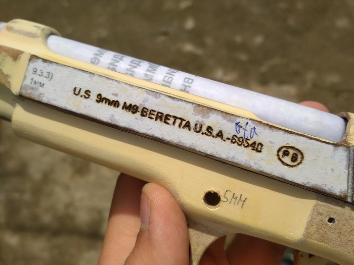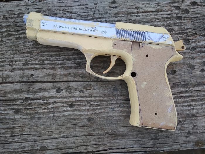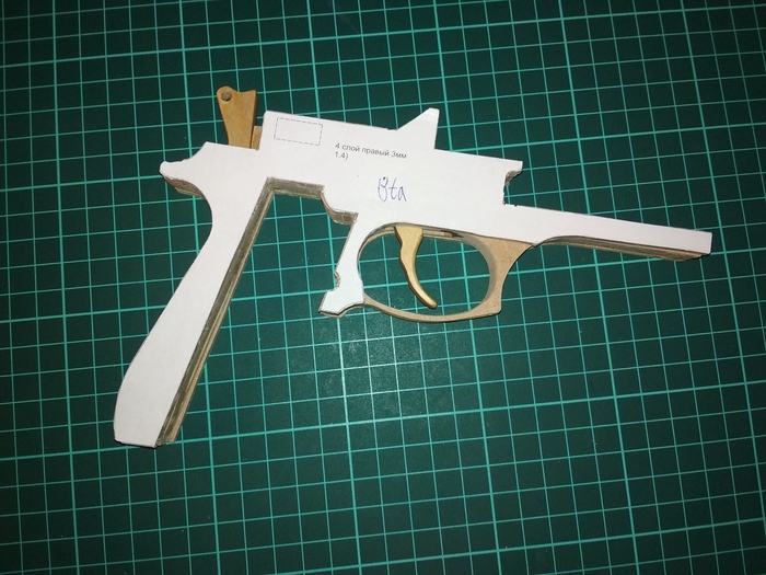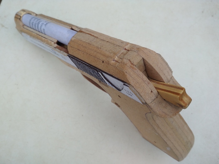 Самоделка состоит из слоёв МДФ, выпиленных электролобзиком, переплётного картона и бумаги. Чтобы уместить все механизмы, пришлось пожертвовать правильной шириной Беретты. Мой макет получился несколько толще.
