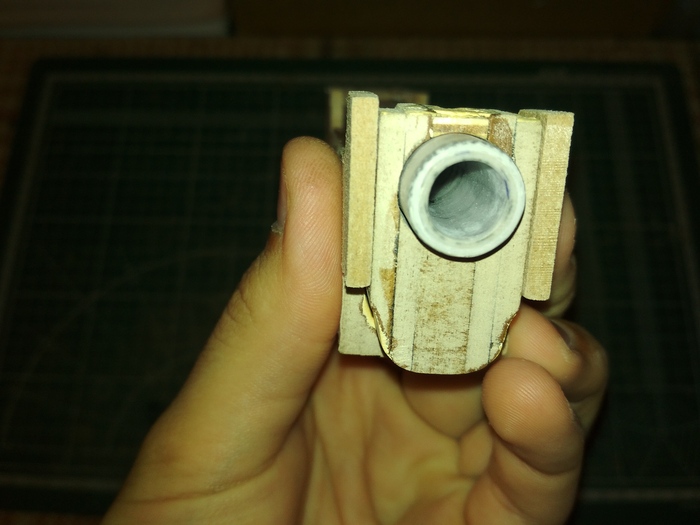 Сборку можно начать с барабана. Здесь вообще ничего сложного. Берём 2 трубки, кладём на ровную поверхность и наносим на стык соединения суперклея. На весу присоединение лучше не проводить, поскольку одна часть будет смотреть влево или вправо, относительно другой.