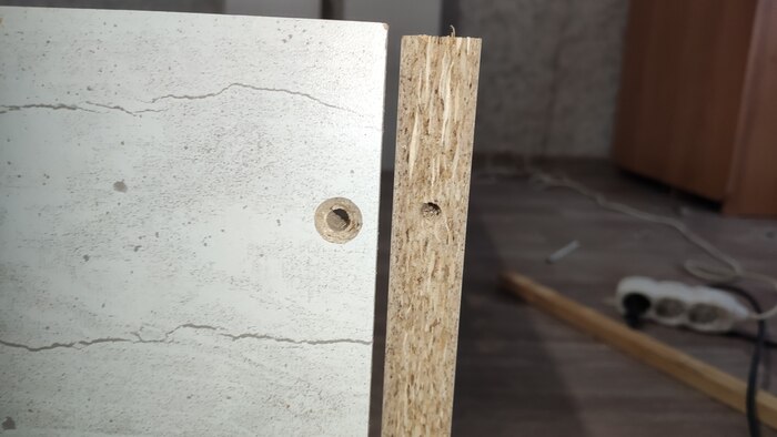 Делаю отверстия маленьким сверлом. Большим сверлом немного снимаю фаску, чтобы потом утопить саморез.