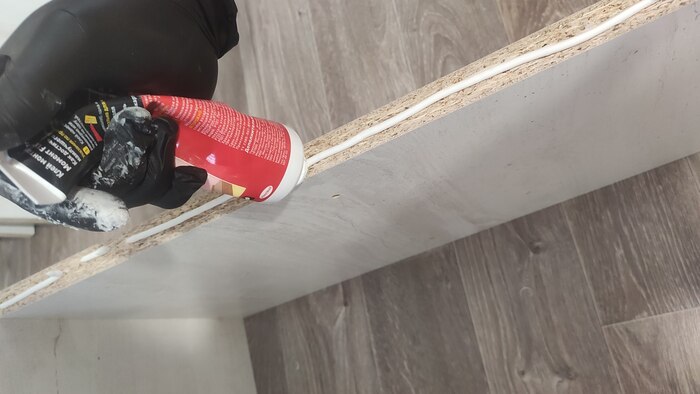 Сначала я нанес тонкий слой (я впервые использовал жидкие гвозди и немного переоценил их), и когда первые полки с кромкой высохли, где-то кромка начала отходить... Кстати, всегда можно "проклеить" горячим утюгом (через лист бумаги), неясно, плавится ли клей или немного плавится кромка и лучше прилегает, я так и не понял.