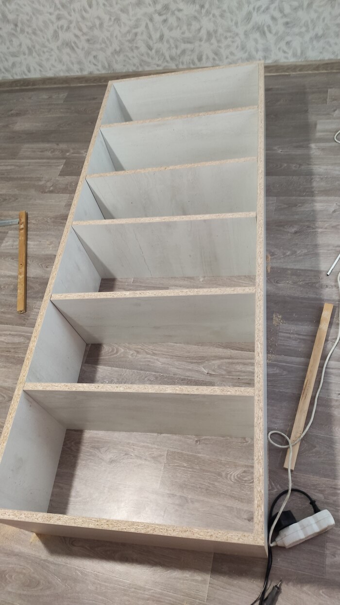 Приветствую всех, читающих! Ранее я собирал стол (пост есть на Пикабу). Размеры, которые я хотел, могли быть выпилены только из большого листа 1,83 м на 2,75 м. После того, как я выпилил столешницу, у меня остался материал. На скорую руку я решил сделать стеллаж из этих остатков. Вот собственно дошли руки, сделать из остатков материала то, что можно назвать стеллаж.
