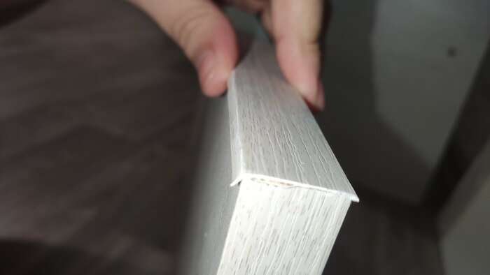 После того как все высохло, перед обрезкой лишней кромки, я рекомендую сначала согнуть выступающую кромку, а потом ее обрезать, так намного удобнее (мебельщики скажут, что это очевидно, но когда делаешь впервые, тебе мало что очевидно, и присутствует уверенность что новый острый нож будет резак легко и ровно).