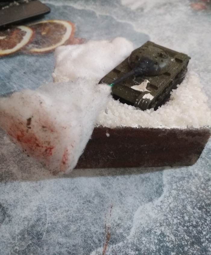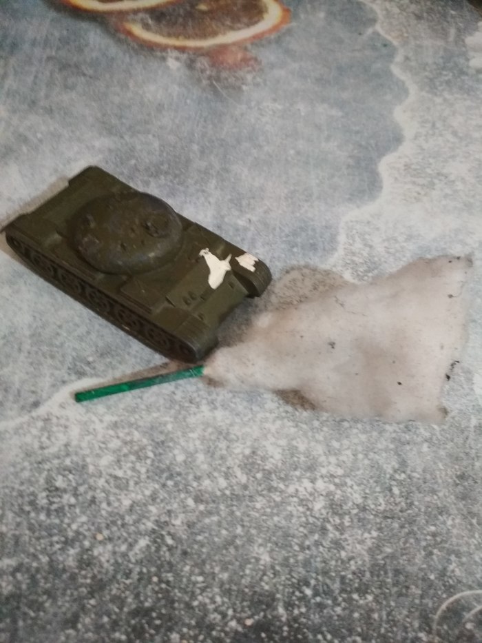 Попросила учитель срочно на завтра принести поделку в школу на военную тему. У сына как раз валяется танк без дела. В ход пошла флористическая губка, вата, соль крупного помола, краски.