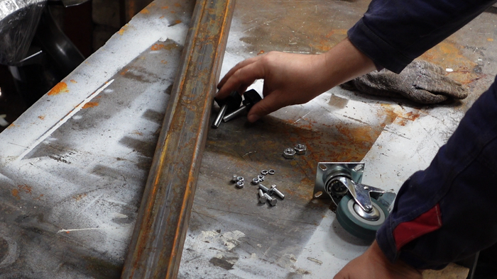 Предыстория: у меня есть тяжелый (200кг) станок и я сварил для него стол. Но стол изначально делал без колесиков чтобы он стоял жестко. Запереть на стол станок оказалось сложной задачей, но еще сложнее оказалось перетащить этот стол на место его постоянного пребывания. Ножки стола цеплялись за бетон и передвинуть его хотя бы на миллиметр не было никакой возможности. Решение пришло быстро. Нужно сделать съемные колесики!