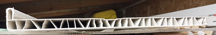 Нижняя сторона была прорезана на полоски вдоль с интервалом в 2-3 см и поперёк примерно по 15-20 см. Потом попытался её же снять, подрезая перемычки. Сразу скажу идея хреновая. Во первых гора пыли. Хоть и делал в сарае, но болгарка пылит пластиком просто ужасно.