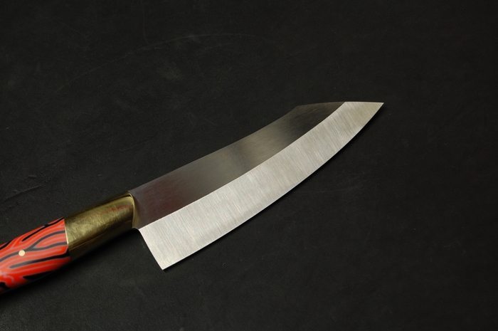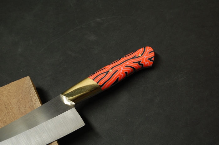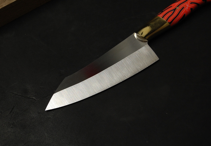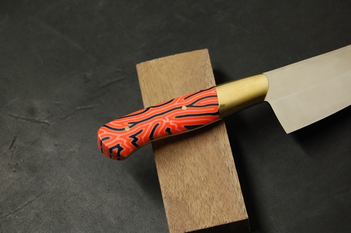 Форма клинка под японские кухонные ножи. По функционалу форма очень хорошая, удобная. Рукоять не совсем в стиле Японии. Там привычно что то более граненое, типо восьмигранных. Я же сделал что то более привычное нашему пользователю. Конструкция ножа фултанг. Яркая часть из микарты крепится за счёт клея и двух латунных пинов 3 мм. Латунную часть принято называть притинами, расклепывается на рукояти так же на латунь. Клепается латунным прутиком и после полируется. Шва не видно совсем. Микарта это композит на основе ткани и эпоксидной смолы. Материал очень прочный, долговечный. Воды не боится совсем. Такая часть из латуни довольно неплохо увеличивает вес ножа. Для кого-то это будет важным фактором. Хотя обычно мастера стараются делать ножи как можно легче. Но можно процитировать один очень известный фильм "Тяжесть — это хорошо. Тяжесть — это надёжно")