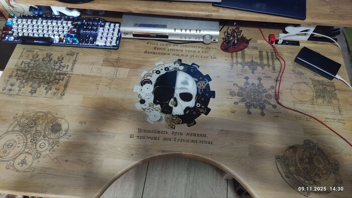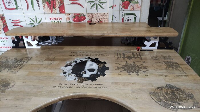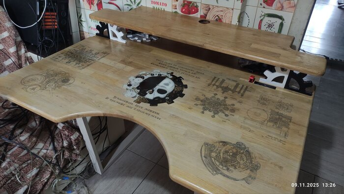 В планах переделать основную столешницу. Хочу купить лазерный гравер и нанести изображения граверовкой, должно быть офигенно. Также пропитать специальным маслом с эффектом состаривания.