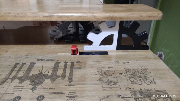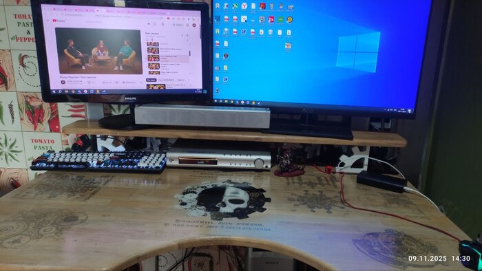 Изначальная идея было в том, чтобы изготовить кронштейны, которые будут крепиться к стене, чтобы стол был без ножек, а также на эти же кронштейны должен был разместиться системник. Это освободило бы пространство под столом и облегчило бы уборку. Но нет доверия к стене, на которую он должен был крепиться. Поэтому просто купил обычное подстолье за 2к. Может когда-нибудь все таки реализую эту идею, мне она очень нравится
