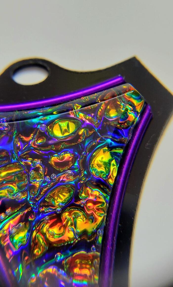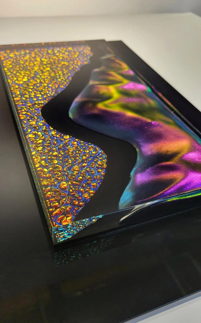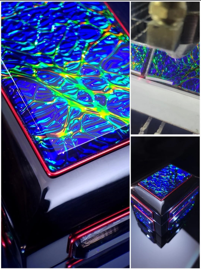 Еще пару лет назад Daniel Cooper на Ютубе над дихроическими пленками издевался и что-то прямо ОЧЕНЬ похожее делал из пленки и УФ отверждаемой смолы. Даже рекламировал конкретные наборы с такими же цветами... Но видео там на канале так много, что уже не найду именно то.
