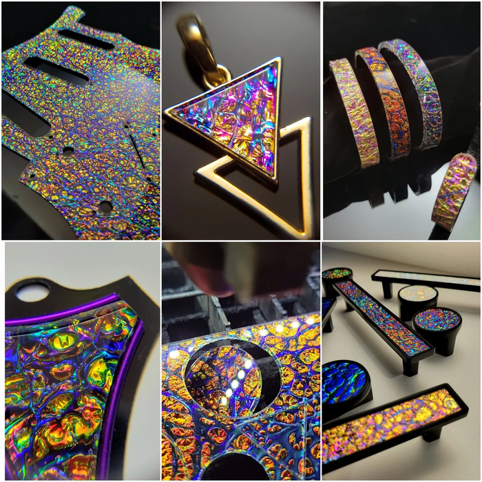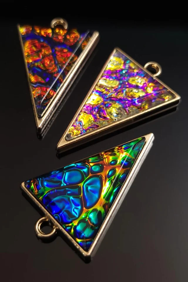 Многие используют в подвесках плавленое дихроичное стекло, которое является наиболее доступной версией искусственного опала. Но что, если бы существовал акриловый лист с такой же трёхмерной текстурой, эффектом смены цвета и насыщенностью цвета, как у дихроичного стекла, но без ограничений, связанных с трудозатратами и изготовлением? Возможно, вам стоит обратить внимание на дихролам (dichrolam).