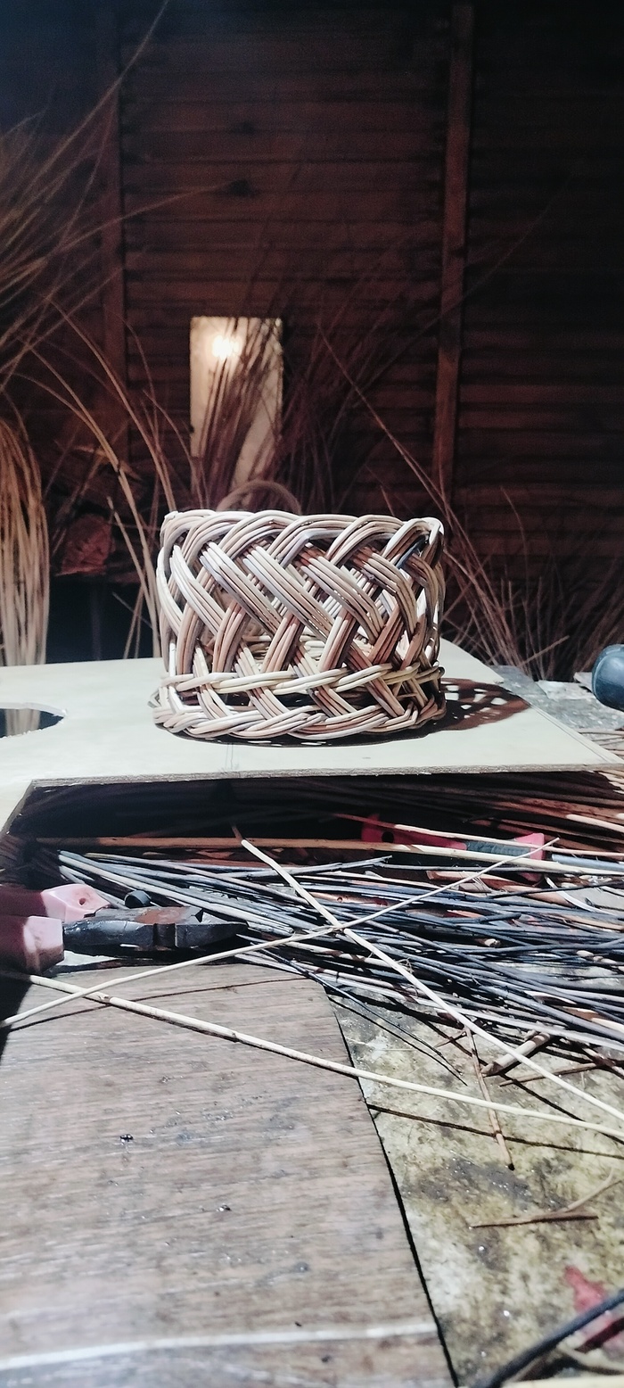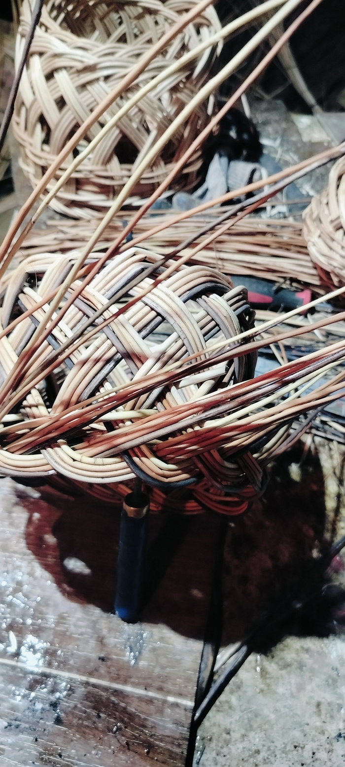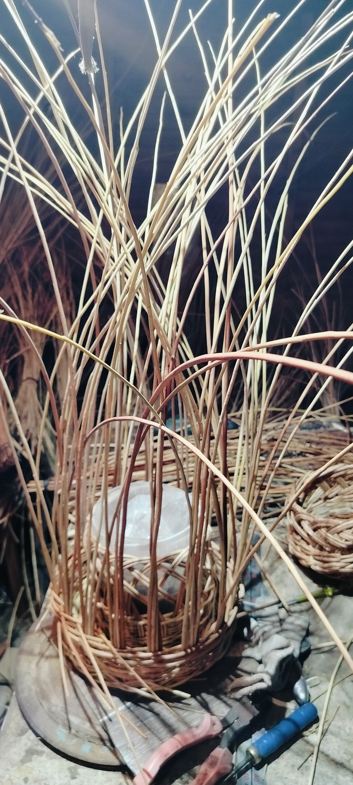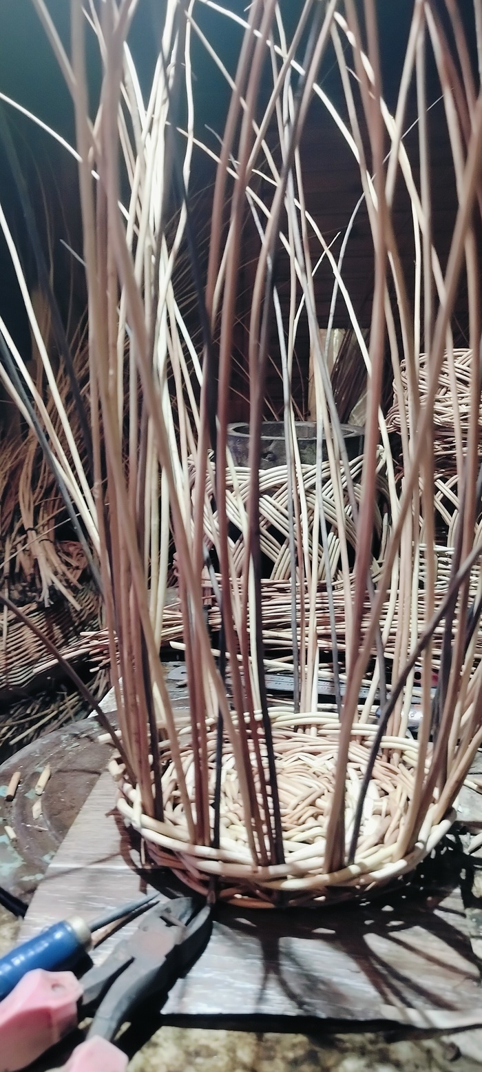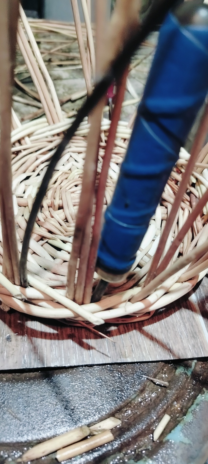 От верёвочки в три прутика остаётся «щель»( показано шилом). Сюда вставляем счетверённые стойки( далее считаем за одну). Немного подсушиваю изделие ( делаем следующее).
