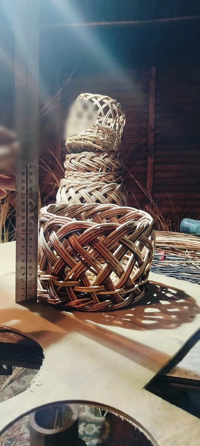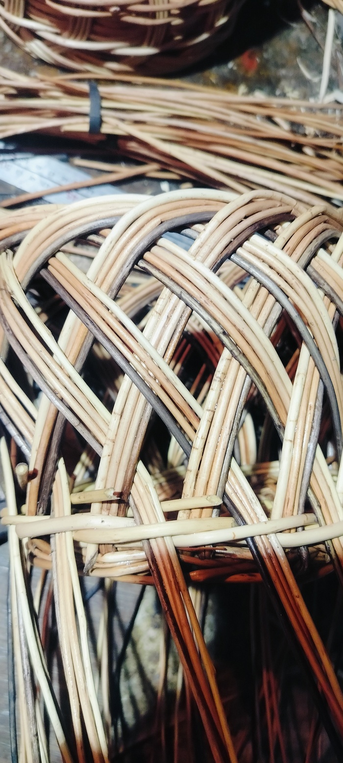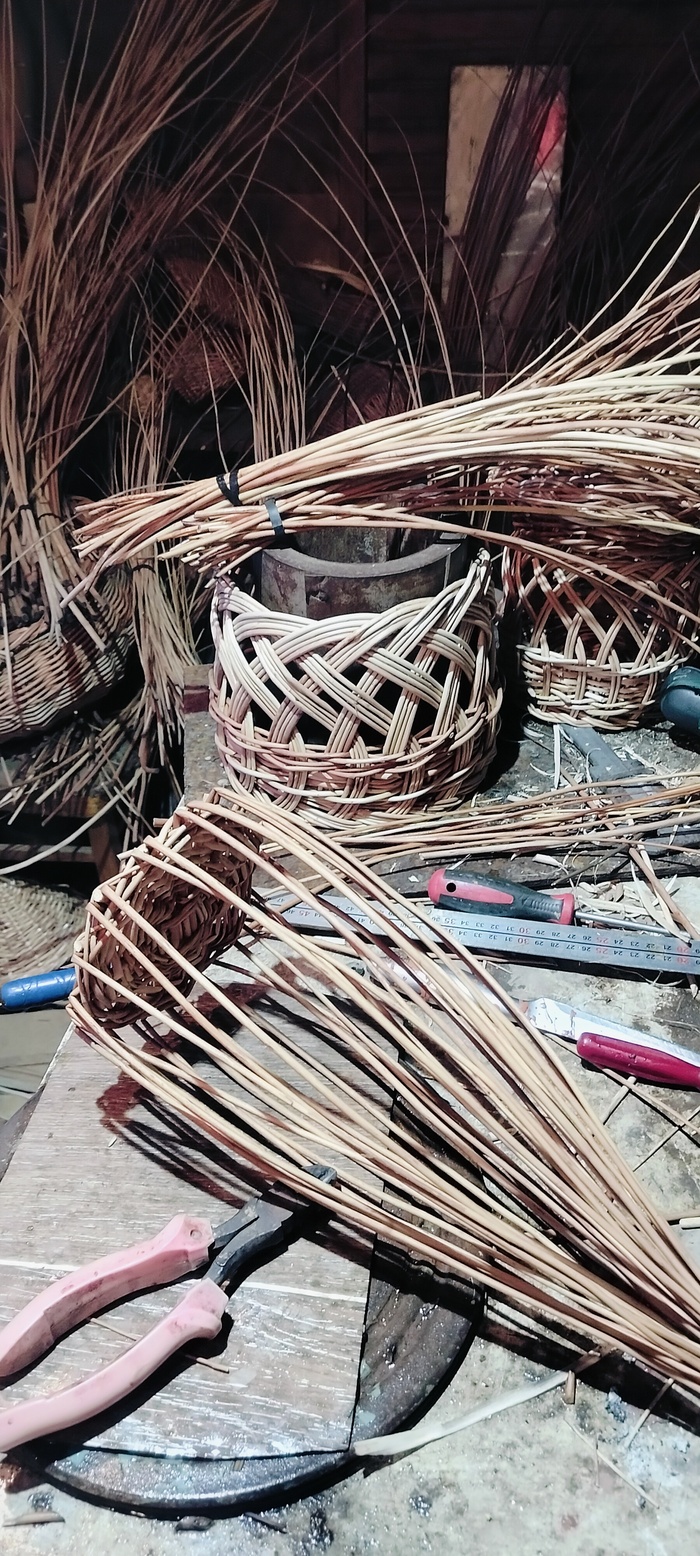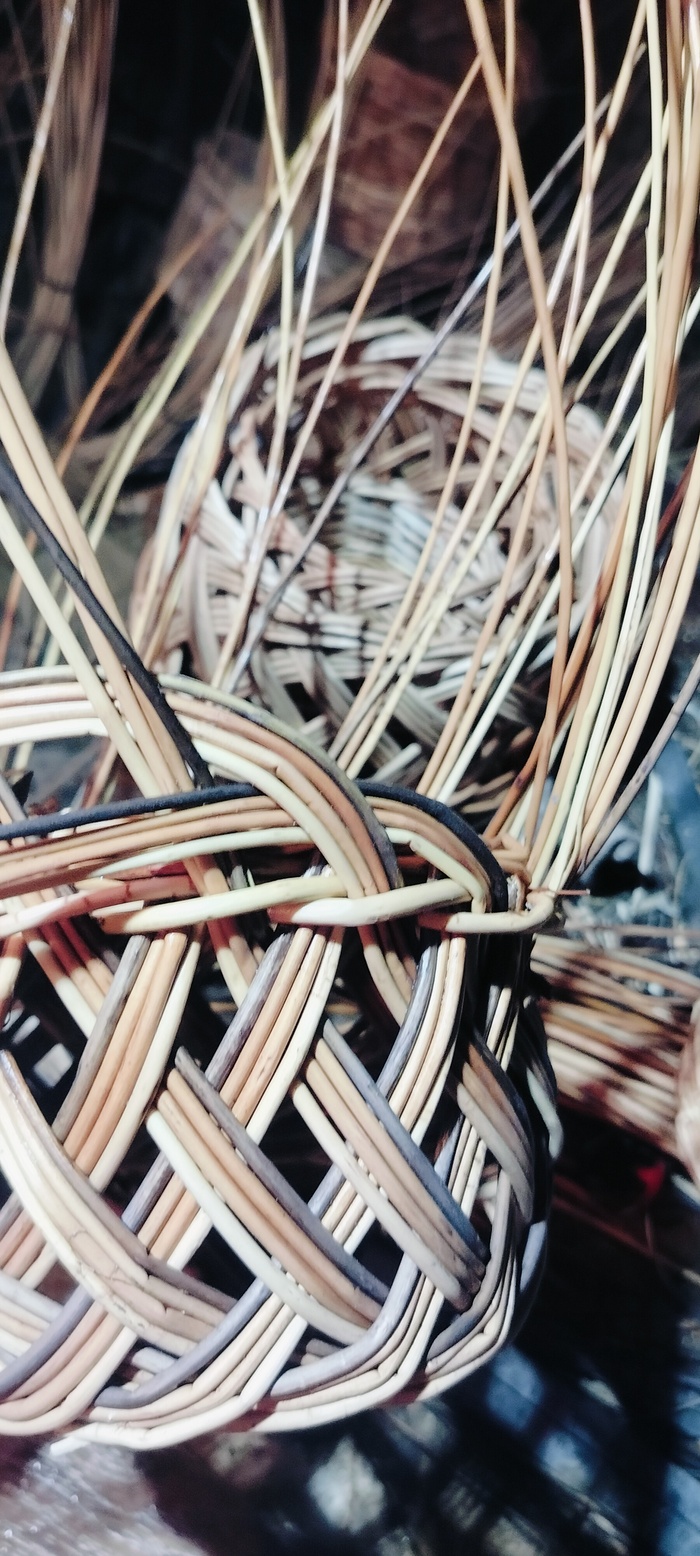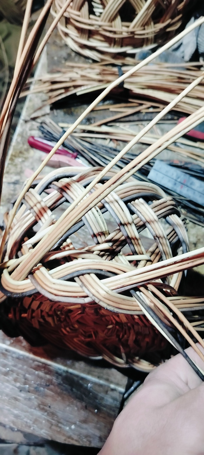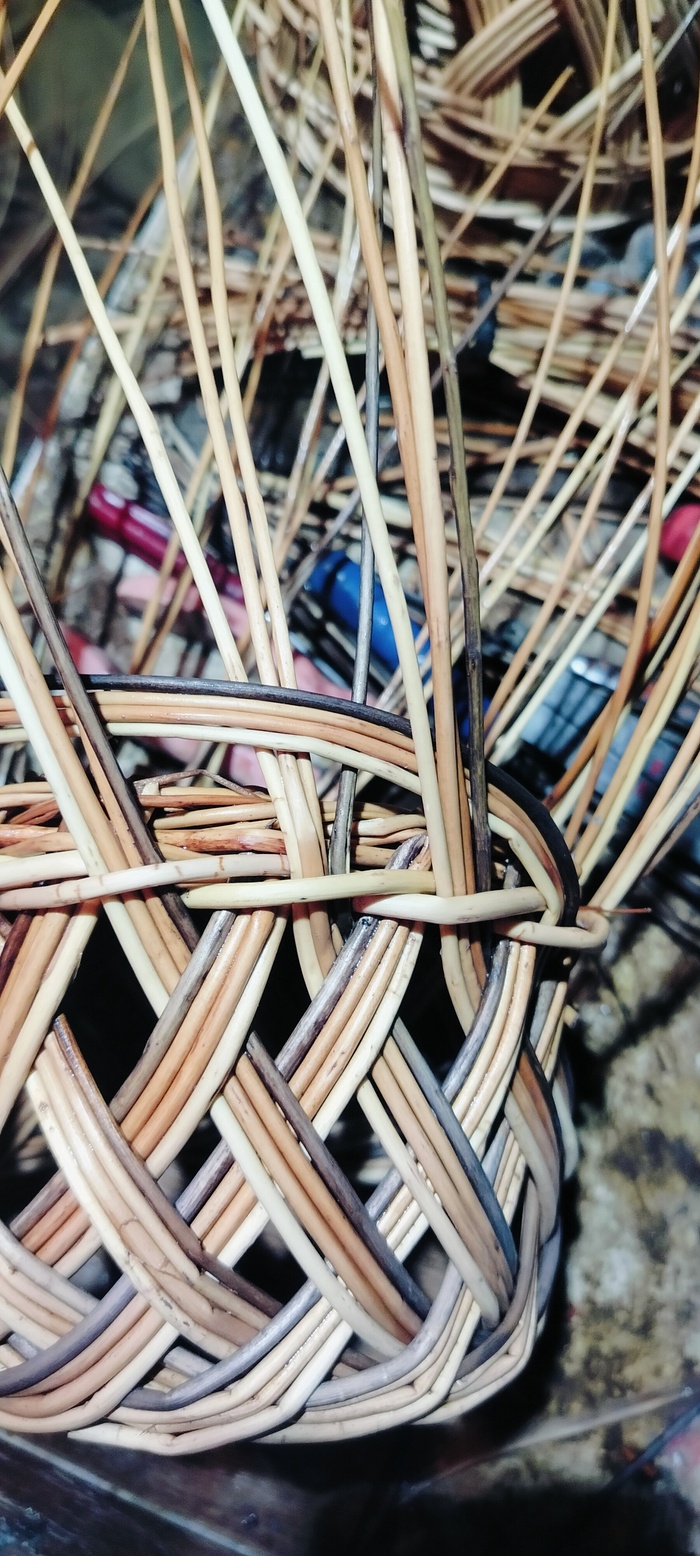 От верёвочки в три прутика остаётся «щель»( показано шилом). Сюда вставляем счетверённые стойки( далее считаем за одну). Немного подсушиваю изделие ( делаем следующее).