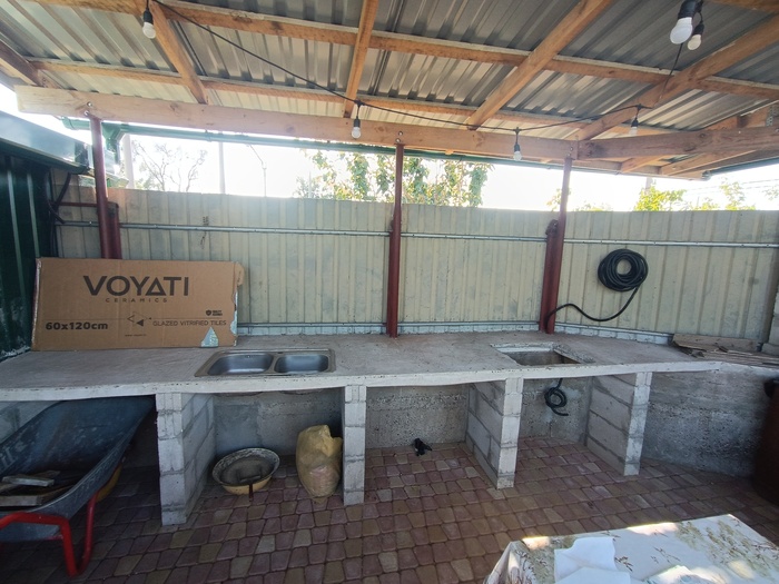 Здравствуйте. Уважаемые мастера-плиточники, помогите со сложной для меня задачей в укладке плитки. Я тут решил не много обустроить себе задний дворик, и сделать что-то типа навес-беседки, где можно было бы посидеть с друзьями, попить пиво и пожарить шашлык.