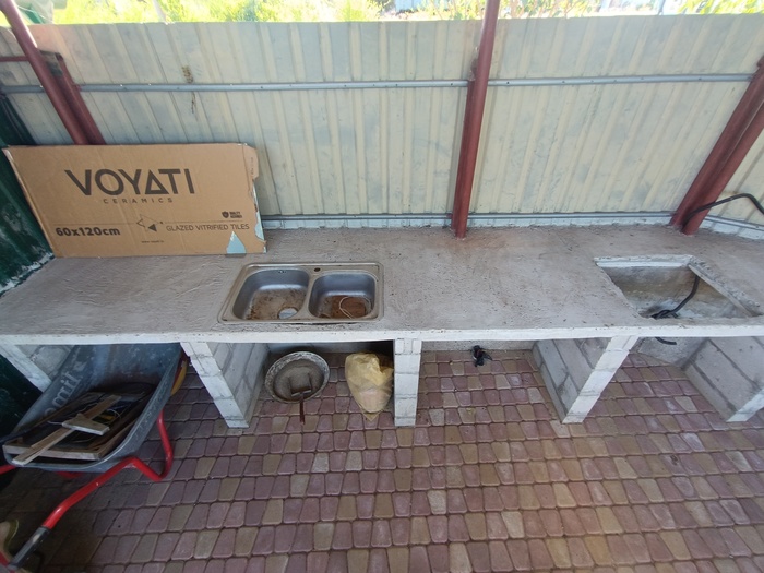 В процессе строительства, решил залить из бетона столешницу, ну и, соответственно, оставил в ней проемы под мойку и под варочную панель. Под новый год были скидки на керамическую плитку, ну и нам с женой приглянулся красивый вариант керамогранитной плиты размером 120*60см. Как я тогда посчитал, что его легко и быстро можно будет уложить самому... но как дошло до него дело - я впал в ступор. я считал, что положу первую плиту , затем вторую плиту между проемами, третью плиту - дальше за вторым проемом, а сами проемы обложу вырезанными кусками... Засада в том, что расстояние между проемами чуть больше, чем сама плита, и вырезать и укладывать 3см полосочку - не комильфо.