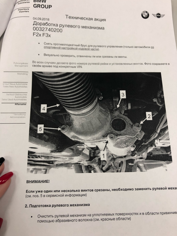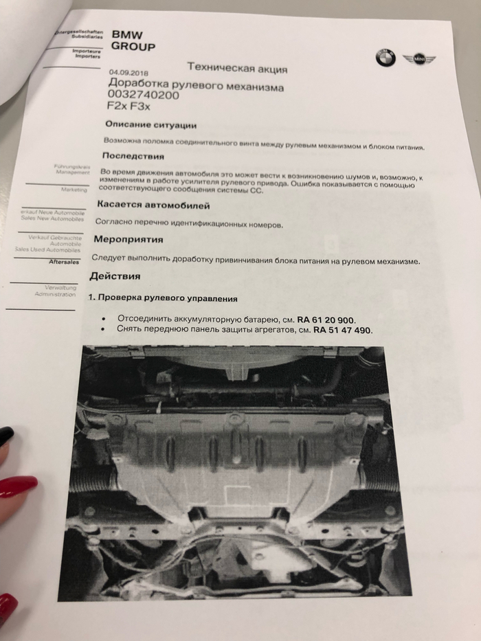 Из вышеизложенного следует, что на некоторых авто марки бмв существует брак в рулевой, который устраняется в дилерских сервисах по гарантии. В частности моя старушка 116 2012 года в данный перечень попала.
