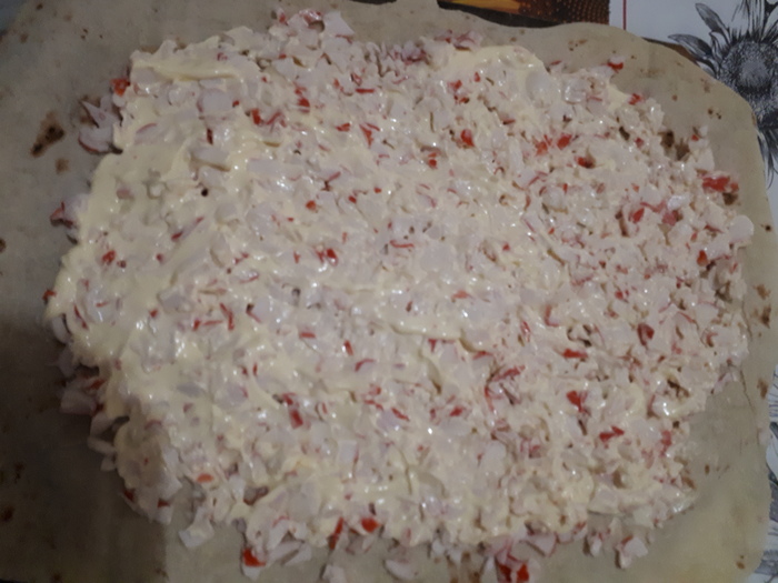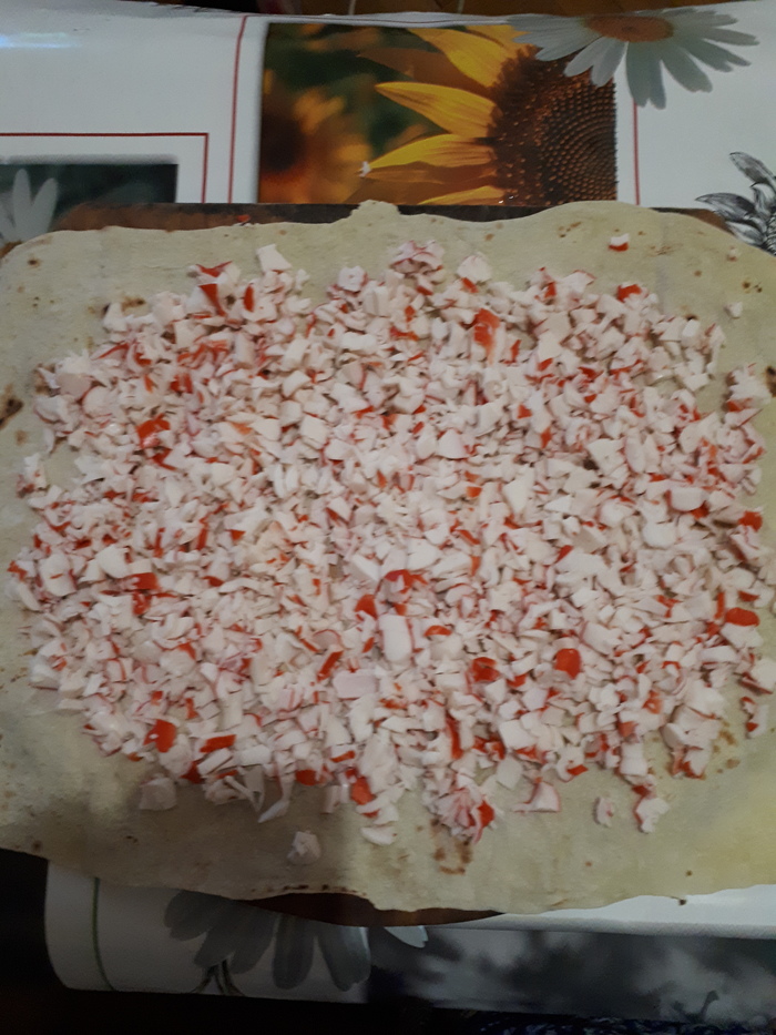 Расстилаю лаваш на доске и выкладываю на него крабовое мясо