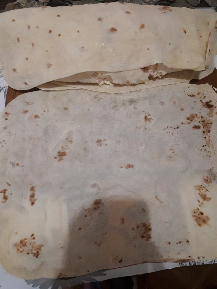 И тут вас может ожидать засада: тонкий армянский лаваш прорвался. Поэтому надо иметь в запасе ещё 2. Аккуратно подкладываем первый. И, на всякий случай, второй