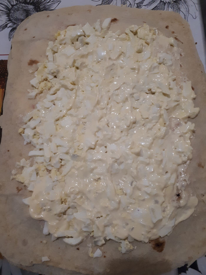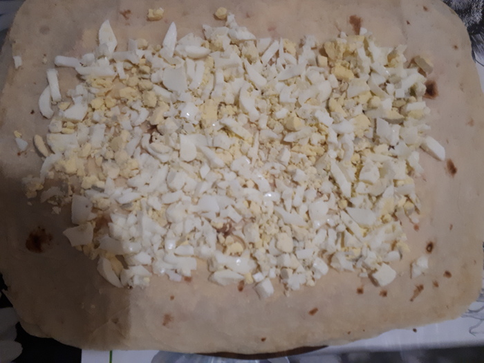 Сверху кладу еще один лаваш. Не смотрите на то, что начинку я выкладываю не до краёв - они потом будут обрезаны. И на этот лаваш выкладываю отваренные вкрутую яйца.
