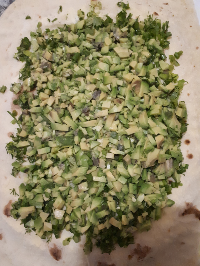 Снова еще 1 лаваш сверху, на который выкладываю зелень. В моём случае это молодой зелёный лук, укроп и кинза.