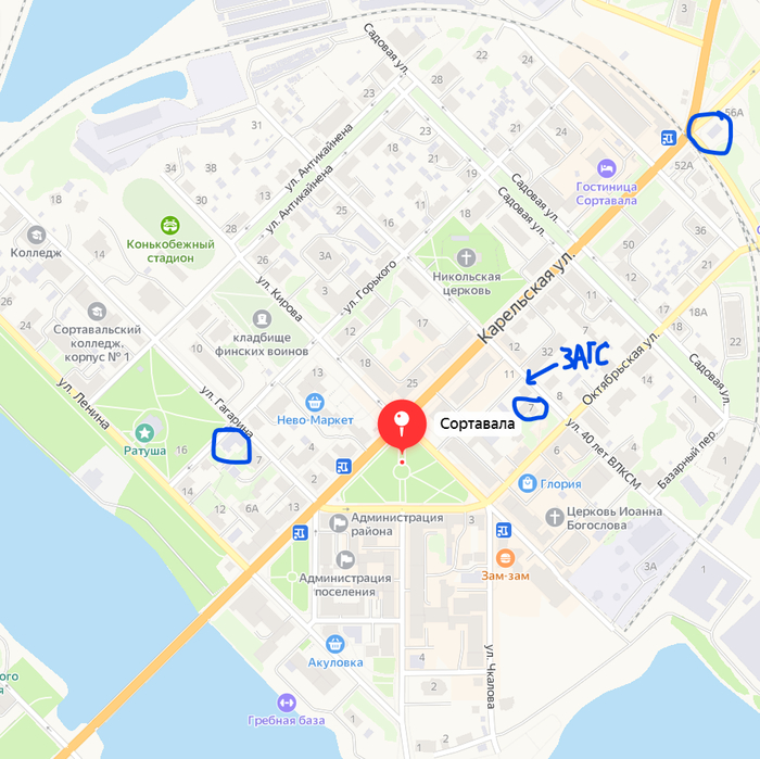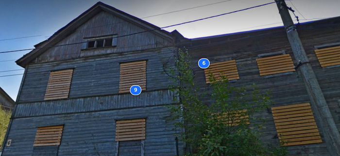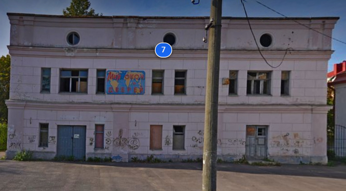 Проходил мимо еще двух (по разговорам с местными жителями их в городе десятки) заброшенных зданий, но сам их не фотографировал, т.к. находился на отдыхе, и внимание было сосредоточено больше на красивых местах. Идея этого поста пришла уже по возвращению из отпуска, поэтому следующие фото будут летнего периода с Яндекс Панорам. Синим цветом обвёл на карте центра г. Сортавала заброшенные здания из этого поста, мимо которых довелось пройти самому: