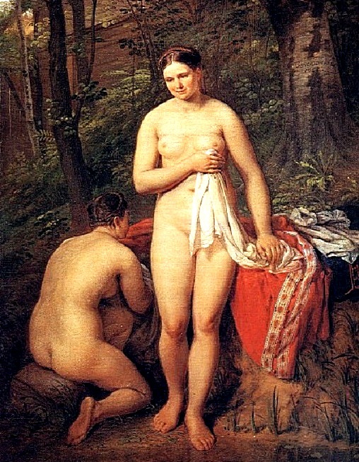 5.Венецианов А.Г. « Купальщицы « . Картина 1829 года .В декабре 1829 Венецианов предложил в Императорскую Академию Художеств для приобретения «картину трудов его, изображающую двух нагих женщин, выходящих из воды», и правление ИАХ постановило купить ее за 700 рублей. Вероятно, покупка не состоялась: картина не вошла в каталоги ИАХ, начиная с каталога Фишера 1842 года . В 1835 или 1836 Венецианов доставил эту картину в Общество Поощрения Художников и в 1837 году она, под названием «Купающиеся женщины», разыгрывалась в первой лотерее ОПХ.