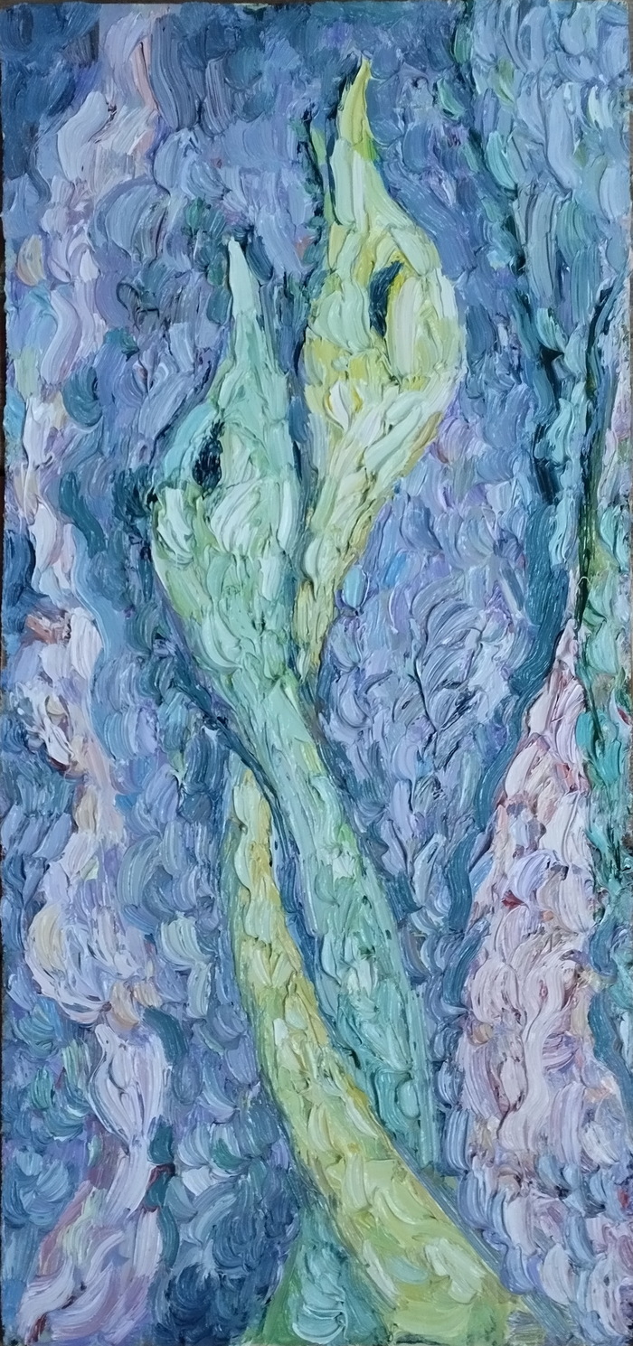 Название к картине я так и не придумала пока. Не знаю, как коротко и точно описать ее. Возможно, оно придет со временем.