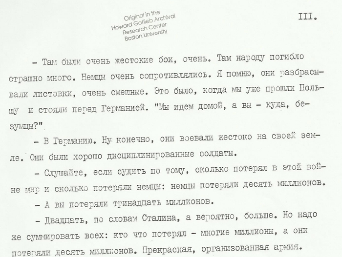 Интервью были записаны на 15 магнитофонных кассет и затем напечатаны 4-мя разными машинистками на 207 страницах. Специально для этого сайта весь техт разбит нами на 15 файлов в точном соответствии с оригинальными аудио файлами. Качество текста сильно варьируется от вполне читаемого до трудно разбираемого."