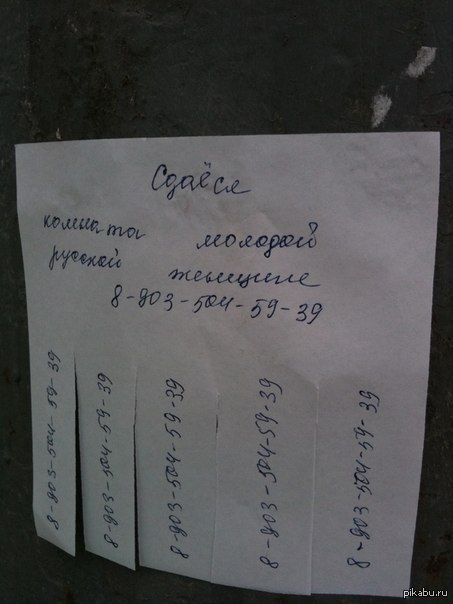 11 boroda742 12 лет назад Сдаёся комната Шел домой и увидел объявление на столбе, улыбнуло :) [моё] Сдаеся Комната Русской Женщины