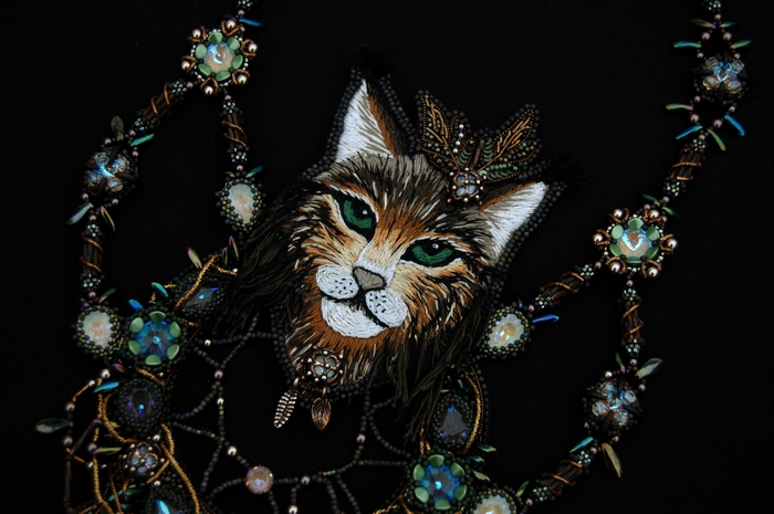 Темой конкурса было "Я". Странная тема, но очень многогранная. На тот момент в жизни у меня был сильный кризис, и часто очень хотелось, чтобы вокруг выросли заросли кустов с огромными колючками - чтобы точно никто больше не смог трогать уставшую меня. И эти ощущения, этот кризис воплотились в работе - Рысь, как личный тотем, темная лесная гамма оттенков, металлические элементы с шипами, бусины в виде колючек, проволока-канитель.
