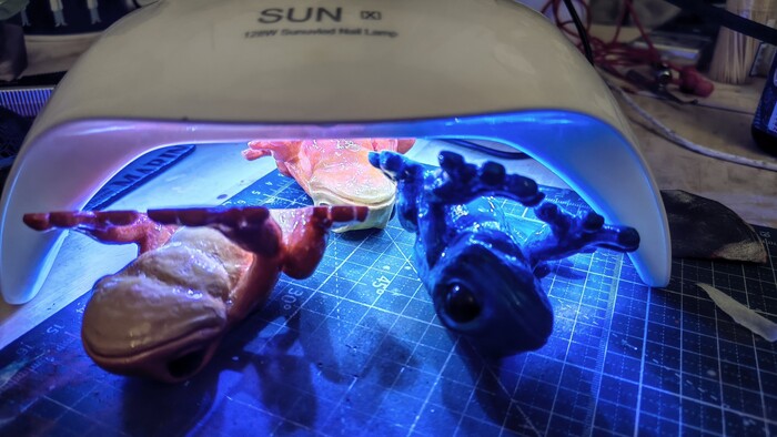 изначально были слеплены из пластилина monster clay, потом отлиты из пластика, покрашены акрилом и залиты эпоксидкой
