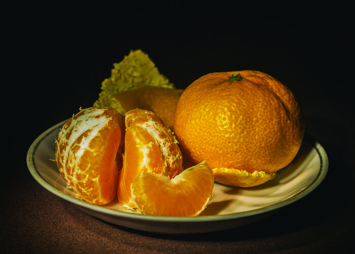 Если найти дома фонарик, то можно использовать прием под названием Световая кисть. Суть такая, ставим выдержку подлиннее, здесь 10 секунд, выключаем свет в комнате и водим фонариком по объекту съемки. За 10 секунд можно от души наелозить пучком света по мандаринам и получить такое) Диафрагма f/7.1, но если не получится, то пойдем в ручной режим и поставим все руками, экспериментальным путем.
