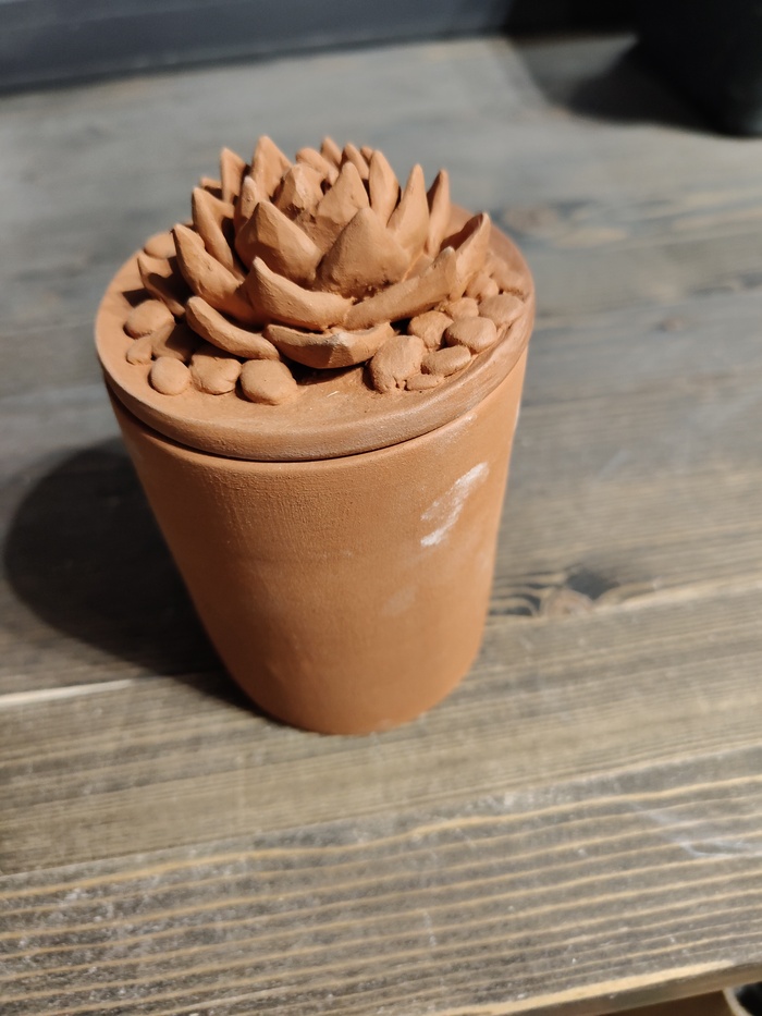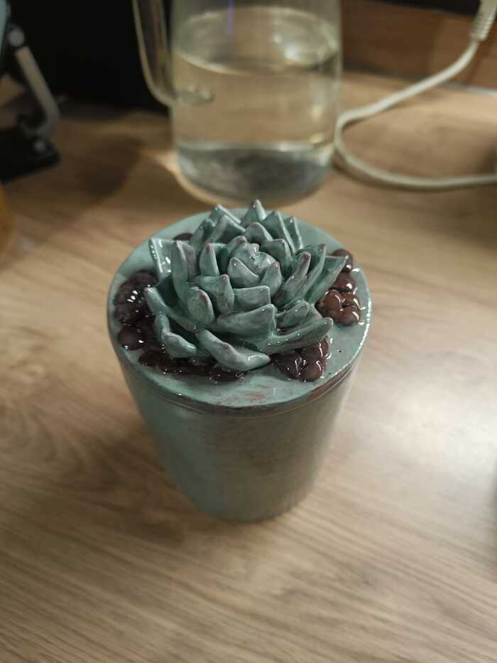 Размеры изделия примерно 20 см в высоту, 7 см в диаметре. Сама баночка сделана на гончарном круге, дно и крышка раскатаны из пласта и "приклеины" шликером как и суккуленты.